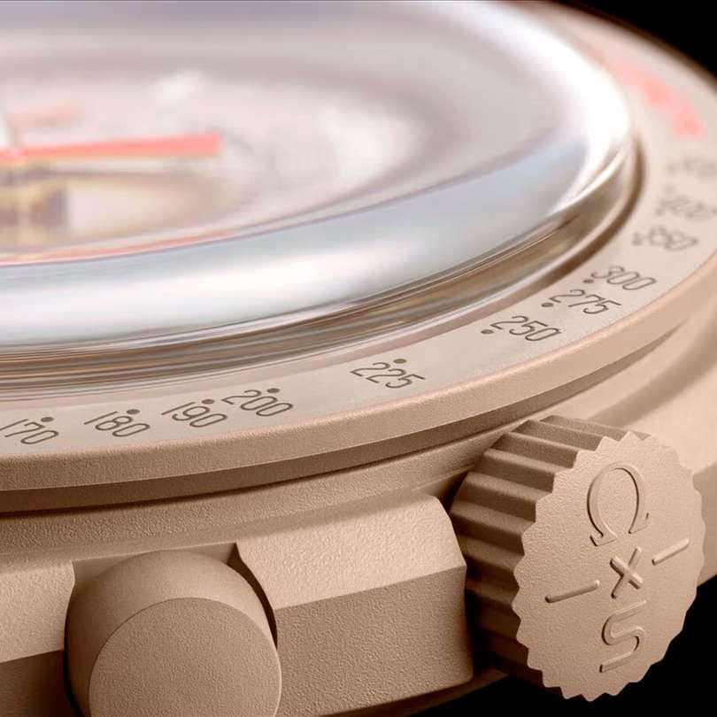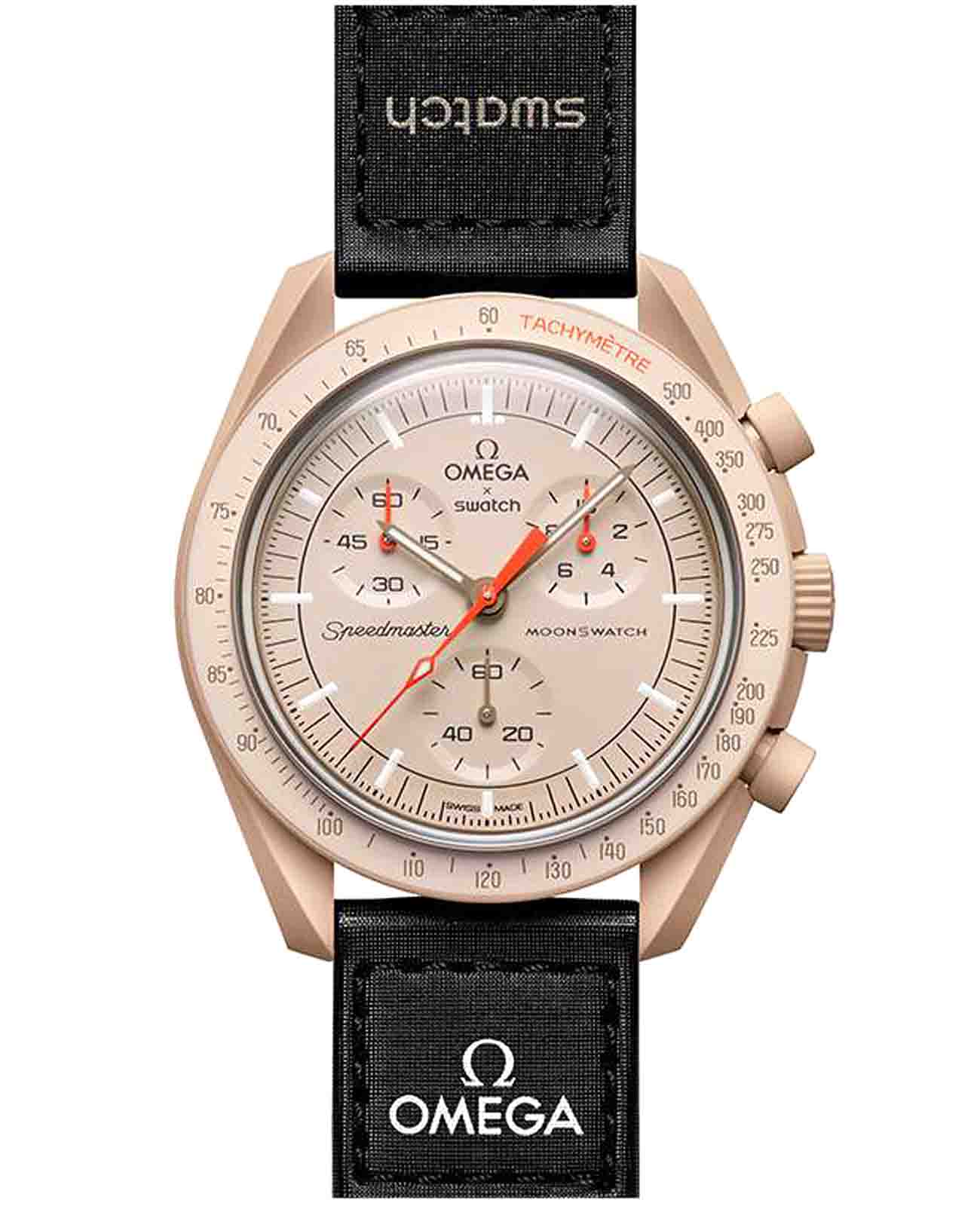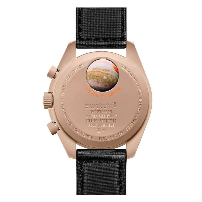 Часы Swatch Bioceramic Moonswatch MISSION TO JUPITER SO33C100 — это стильный и современный аксессуар для тех, кто ценит лёгкость и комфорт. Корпус диаметром 42 мм и пряжка этих уникальных часов изготовлены из биокерамикиБиокерамикаБиокерамика — это материал, который на две трети состоит из керамики, на одну треть — из биопластика. Он сочетает в себе лучшие качества обоих материалов и обладает прочностью и шелковистой на ощупь текстурой., а также ремешок VELCRO®. Модель оснащена бежевым циферблатом и биокерамическим безелемБезельВнешний ободок, закрепляющий стекло. В спортивных часах так называется поворотное кольцо с делениями на циферблате, выполняет роль таймера – замеряет отрезки времени на шкале. Неподвижный безель – элемент декора. Однонаправленно вращающийся безель на дайверских часах позволяет фиксировать моменты погружения и выныривания на поверхность. на который нанесена шкала тахиметраТахиметрРазмеченная шкала, располагается на ободке или безеле часов. Тахиметр позволяет рассчитать скорость на определённом участке пути, расстояние измеряется в километрах или милях.. Общими характеристиками всех часов в данной коллекции являются конструкция стекла из биоматериала, «скрытая» в центре кристалла буква "S", тонкий и изящный круговой узор на внешнем кольце циферблата и заглубленных мини-циферблатах, гладкие ушки с заостренными концами, культовая точка над отметкой 90 на тахиметрической шкале безеля и, конечно же, уникальный материал – биокерамика. Индексы, часовая, минутная и секундная стрелки хронографаХронографФункция позволяет измерять отрезки времени с особой точностью: часы, минуты, секунды. Верным признаком хронографа является наличие на циферблате 3 дополнительных окошек-счётчиков. покрыты люминесцентным покрытиемЛюминесцентное покрытиеПозволяет считывать показания времени в темноте. Производители наносят на стрелки, часовые индексы, безель или поверхность циферблата светонакопительный состав, дающий холодное свечение. Super-LumiNova® класса А, благодаря чему они светятся в темноте. Циферблаты каждых часов в данной коллекции украшены фирменным знаком OMEGA X Swatch, культовым логотипом Speedmaster и логотипом MoonSwatch.