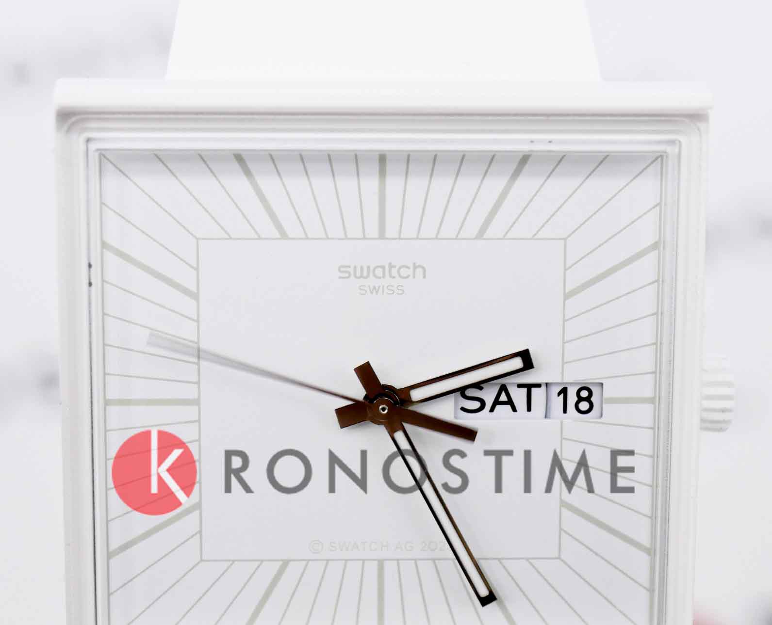 Swatch Square Bioceramic Standard SO34W700 "WHAT IF...ALLWHITE?" - это стильные квадратные часы с корпусом 41,8*41,8 мм из матовой биокерамики белого цвета. Модель оснащена кварцевым механизмом, окошком даты и дня недели, водонепроницаемостью до 20 метров. Часы имеют белый матовый ремешок из биоматериала, белый циферблат и стекло из биоматериала. Стрелки с люминесцентным покрытиемЛюминесцентное покрытиеПозволяет считывать показания времени в темноте. Производители наносят на стрелки, часовые индексы, безель или поверхность циферблата светонакопительный состав, дающий холодное свечение.. Эта экологичная модель унисекс сочетает инновационные материалы с необычным полностью белым дизайном с серебристыми индексами и стрелками, вдохновленным оригинальным Swatch 1983 года, и подходит для тех, кто ценит минимализм и заботу об окружающей среде.