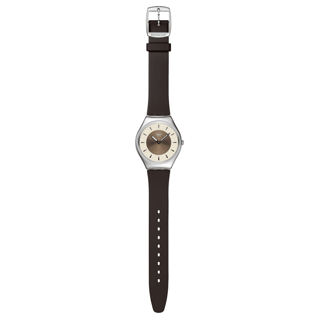 Часы Swatch SYXS158 — это стильный и современный аксессуар для тех, кто ценит лёгкость и комфорт. Часы идеально подойдут как для мужчин, так и для женщин. Эти ультратонкие часы имеют светло-коричневый циферблат с радиальной полировкой, внешним кольцевым принтом цвета слоновой кости и темно-коричневыми часовыми индексами, а также черные часовую и минутную стрелки с эффектом свечения в темноте благодаря люминесцентному покрытиюЛюминесцентное покрытиеПозволяет считывать показания времени в темноте. Производители наносят на стрелки, часовые индексы, безель или поверхность циферблата светонакопительный состав, дающий холодное свечение.. Блестящий корпус и пряжка из нержавеющей стали прекрасно сочетаются с темно-коричневым ремешком с тренчиком в тон и матовой изнанкой цвета слоновой кости. Водозащита 30 метров делает часы практичными для повседневного использования. Эти часы подойдут для повседневного ношения и станут ярким акцентом в вашем наряде.