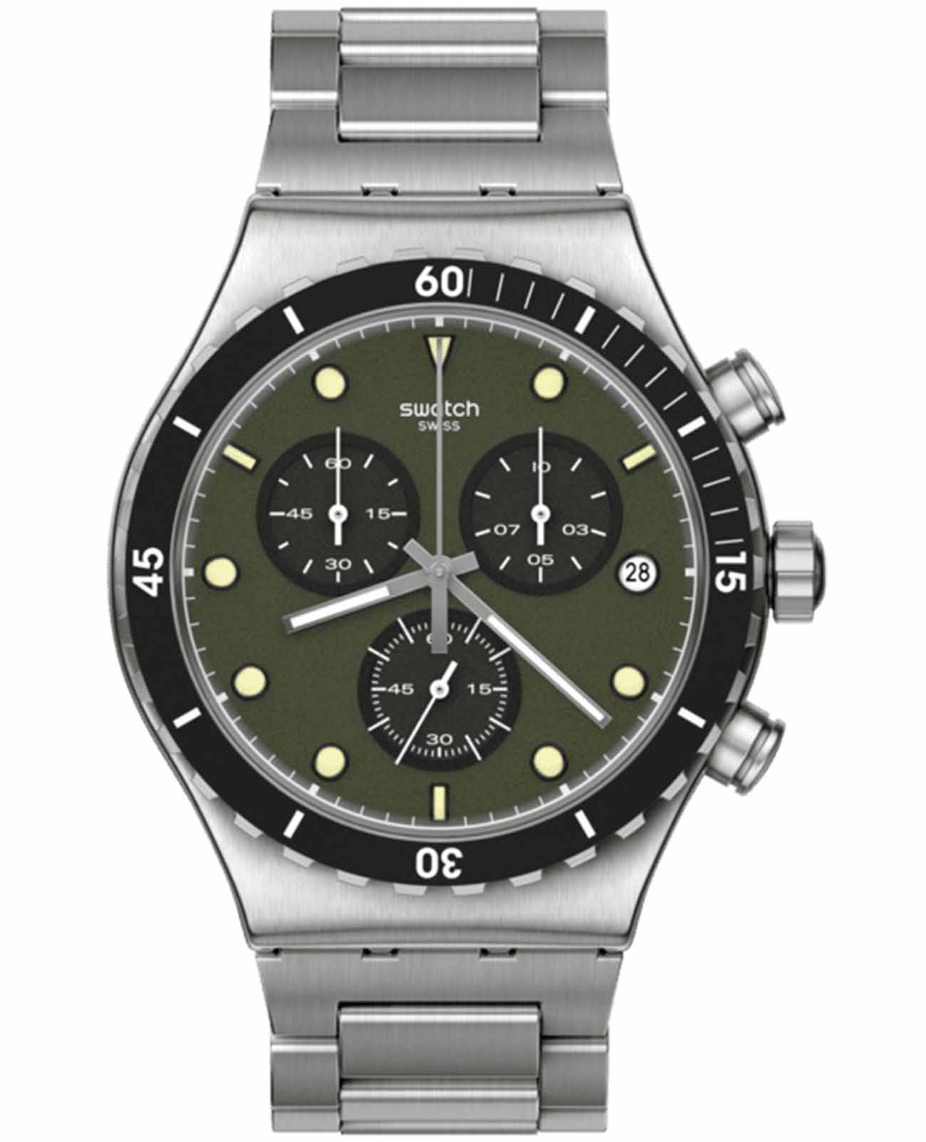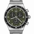 Часы Swatch YVS488G — это стильный и современный аксессуар для тех, кто ценит лёгкость и комфорт. Эта стильная модель часов из нержавеющей стали дополнена матовым металлическим браслетом из нержавеющей стали со съемными звеньями и застёжкой «бабочка»Застёжка "бабочка"Такой вид застёжки дополняется предохранителями, помогающими избежать случайного раскрытия браслета. Обладают изящным исполнением. . Зеленый матовый циферблат с хронографомХронографФункция позволяет измерять отрезки времени с особой точностью: часы, минуты, секунды. Верным признаком хронографа является наличие на циферблате 3 дополнительных окошек-счётчиков. и светящимися в темноте индексами и стрелками из-за люминесцентного покрытияЛюминесцентное покрытиеПозволяет считывать показания времени в темноте. Производители наносят на стрелки, часовые индексы, безель или поверхность циферблата светонакопительный состав, дающий холодное свечение. заключен в матовый корпус из нержавеющей стали. Завершают образ индикатор даты в положении «3 часа» на циферблате, а также серебристые цифры и индексы на безелеБезельВнешний ободок, закрепляющий стекло. В спортивных часах так называется поворотное кольцо с делениями на циферблате, выполняет роль таймера – замеряет отрезки времени на шкале. Неподвижный безель – элемент декора. Однонаправленно вращающийся безель на дайверских часах позволяет фиксировать моменты погружения и выныривания на поверхность. из нержавеющей стали с черным PVDPVDУльтратонкое покрытие наносится в технике вакуумного напыления, сочетает в себе нитрид титана особой прочности со слоем золота или оксида хрома. Несёт в себе декоративную или защитную функцию. покрытием. Водозащита 30 метров делает часы практичными для повседневного использования. Эти часы подойдут для повседневного ношения и станут ярким акцентом в вашем наряде.