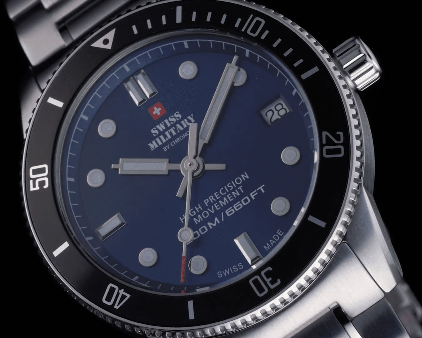Швейцарский кварцевый механизм. Центральные часовая, минутная и секундная стрелки, окошко даты. Часы оснащены функцией EOL - индикация низкого уровня заряда батареи. Стекло K1 - уникальный материал, сочетающий в себе твёрдость сапфирового стекла и прочность минерального. На стрелки и маркеры часов нанесен светонакопительный состав. Однонаправленный поворотный безель. Завинчивающаяся заводная головка. Регулируемый по длине литой браслет из нержавеющей стали. Браслетный замок с тройным сгибом, расстегиваемый одним касанием. Часы имеют маркировку Swiss Made являющуюся гарантом, что все комплектующие и сборка часов произведены на территории Швейцарии. Право нанесения данной маркировки на наручные часы регулируется швейцарскими и международными законами.