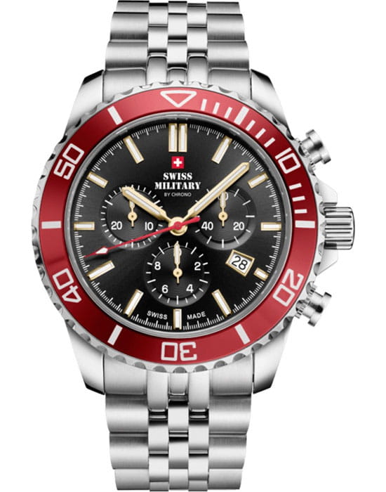 Часы Swiss Military SM34103.03 — это спортивный хронограф, сочетающий стиль и функциональность. Корпус диаметром 43 мм выполнен из нержавеющей стали, что обеспечивает долговечность и надёжность. Циферблат с солнечным узором украшен белыми люминесцентными индексамиЛюминесцентное покрытиеПозволяет считывать показания времени в темноте. Производители наносят на стрелки, часовые индексы, безель или поверхность циферблата светонакопительный состав, дающий холодное свечение. и стрелками, что позволяет легко считывать время в любых условиях. Защиту циферблата обеспечивает сапфировое стеклоСапфировое стеклоПрочный и надёжный материал из кристалла сапфира синтетического происхождения, характеризующийся особой твёрдостью и устойчивостью к царапинам и повреждениям., устойчивое к царапинам. Модель оснащена вращающимся безелемБезельВнешний ободок, закрепляющий стекло. В спортивных часах так называется поворотное кольцо с делениями на циферблате, выполняет роль таймера – замеряет отрезки времени на шкале. Неподвижный безель – элемент декора. Однонаправленно вращающийся безель на дайверских часах позволяет фиксировать моменты погружения и выныривания на поверхность. с PVD-покрытиемPVDУльтратонкое покрытие наносится в технике вакуумного напыления, сочетает в себе нитрид титана особой прочности со слоем золота или оксида хрома. Несёт в себе декоративную или защитную функцию., что добавляет дополнительную функциональность. Водозащита до 10 ATM делает часы подходящими для плавания и других водных активностей. Швейцарский кварцевый механизм Ronda 5040.D обеспечивает высокую точность измерения времени и функции хронографа. Браслет из нержавеющей стали с матовой и полированной отделкой и раскладной застёжкойРаскладная застёжкаТакой тип застёжки используется только на браслетах из металла. Она никогда не раскрывается полностью, происходит разделение на 2 и более частей. Раскладывающая застёжка снизит вероятность потери часов к минимуму. гарантирует комфортное ношение и надёжную фиксацию. Часы сопровождаются 5-летней международной гарантией, подтверждающей их высокое качество и надёжность. Swiss Military — это идеальный выбор для мужчин, которые ценят швейцарское качество и ведут активный образ жизни.