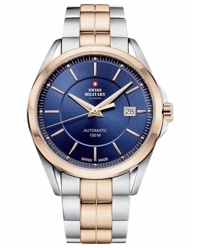 Мужские швейцарские наручные часы Swiss Military by Chrono SMA34085.10, механический механизм (автоматический калибр) с высокой точностью. Сапфировое стеклоСапфировое стеклоПрочный и надёжный материал из кристалла сапфира синтетического происхождения, характеризующийся особой твёрдостью и устойчивостью к царапинам и повреждениям. устойчивое к появлению царапин, обладающее высокой прозрачностью. Класс водозащиты: 100 метров, позволит плавать, нырять и заниматься другими водными видами спорта. Корпус часов изготовлен из стали с частичным PVD-покрытиемPVDУльтратонкое покрытие наносится в технике вакуумного напыления, сочетает в себе нитрид титана особой прочности со слоем золота или оксида хрома. Несёт в себе декоративную или защитную функцию., цвета желтое золото. Люминесцентная подсветкаЛюминесцентное покрытиеПозволяет считывать показания времени в темноте. Производители наносят на стрелки, часовые индексы, безель или поверхность циферблата светонакопительный состав, дающий холодное свечение. стрелок. Браслет с раскладной застёжкойРаскладная застёжкаТакой тип застёжки используется только на браслетах из металла. Она никогда не раскрывается полностью, происходит разделение на 2 и более частей. Раскладывающая застёжка снизит вероятность потери часов к минимуму..