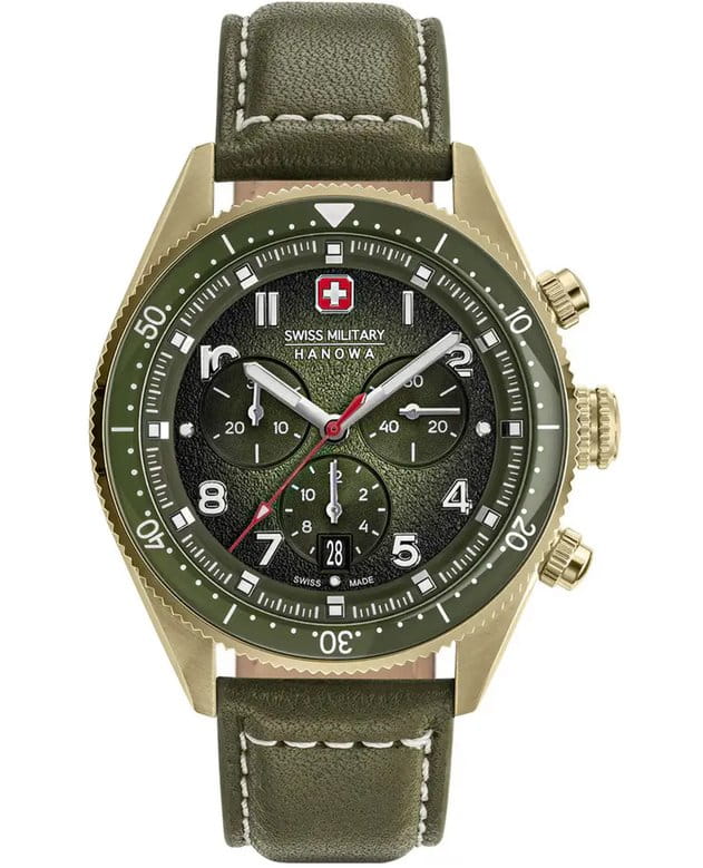 Мужские наручные часы-хронографХронографФункция позволяет измерять отрезки времени с особой точностью: часы, минуты, секунды. Верным признаком хронографа является наличие на циферблате 3 дополнительных окошек-счётчиков. Swiss Military Hanowa SMWGC0003802 из коллекции Greyhound Chrono сочетают в себе спортивный дизайн и надежность современных технологий. Модель обладает круглым корпусом диаметром 45 мм, изготовленным из нержавеющей стали, что обеспечивает высокую устойчивость к внешним воздействиям. Для защиты циферблата используется сапфировое стеклоСапфировое стеклоПрочный и надёжный материал из кристалла сапфира синтетического происхождения, характеризующийся особой твёрдостью и устойчивостью к царапинам и повреждениям., гарантирующее прочную защиту от царапин. БезельБезельВнешний ободок, закрепляющий стекло. В спортивных часах так называется поворотное кольцо с делениями на циферблате, выполняет роль таймера – замеряет отрезки времени на шкале. Неподвижный безель – элемент декора. Однонаправленно вращающийся безель на дайверских часах позволяет фиксировать моменты погружения и выныривания на поверхность. с IP-покрытиемIP-покрытиеМетод ионного напыления. Демонстрирует повышенную устойчивость к истиранию, окислению и химическим веществам. Под воздействием высокого давления и температуры около 1500°C молекулы металла надёжно соединяются с частицами корпуса часов.. Часы оснащены высококачественным швейцарским кварцевым механизмом Ronda 5030, который позволяет точно измерять время благодаря функции секундомераСекундомерСекундоме́р — прибор, способный измерять интервалы времени с точностью до долей секунды.. Циферблат украшен метками в виде арабских цифр и точек, а стрелки и метки покрыты люминесцентным покрытиемЛюминесцентное покрытиеПозволяет считывать показания времени в темноте. Производители наносят на стрелки, часовые индексы, безель или поверхность циферблата светонакопительный состав, дающий холодное свечение., что обеспечивает удобство чтения времени в темноте. Ремешок часов выполнен из натуральной кожи, что добавляет комфорта при длительном ношении. Модель также оснащена окном даты в положении «6 часов», завинчивающейся заводной головкой и имеет водонепроницаемость до 10 атмосфер (100 метров), что позволяет использовать их во время плавания и других водных видов спорта.