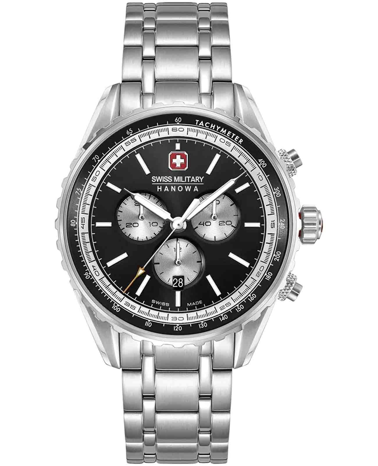 Мужские швейцарские часы Swiss Military Hanowa Afterburn Chrono SMWGI0000309 с хронографомХронографФункция позволяет измерять отрезки времени с особой точностью: часы, минуты, секунды. Верным признаком хронографа является наличие на циферблате 3 дополнительных окошек-счётчиков. и секундомеромСекундомерСекундоме́р — прибор, способный измерять интервалы времени с точностью до долей секунды.. Сапфировое стеклоСапфировое стеклоПрочный и надёжный материал из кристалла сапфира синтетического происхождения, характеризующийся особой твёрдостью и устойчивостью к царапинам и повреждениям. с антибликовым покрытием защищает циферблат от царапин и обеспечивает отличную читаемость при любом освещении. Корпус из нержавеющей стали диаметром 44 мм сбалансирован и элегантен. Браслет с раскладной застёжкойРаскладная застёжкаТакой тип застёжки используется только на браслетах из металла. Она никогда не раскрывается полностью, происходит разделение на 2 и более частей. Раскладывающая застёжка снизит вероятность потери часов к минимуму. идеально дополняют дизайн часов, обеспечивая комфортное ношение. Люминесцентное покрытиеЛюминесцентное покрытиеПозволяет считывать показания времени в темноте. Производители наносят на стрелки, часовые индексы, безель или поверхность циферблата светонакопительный состав, дающий холодное свечение. стрелок и меток позволит вам следить за временем даже в полной темноте. Стальной безельБезельВнешний ободок, закрепляющий стекло. В спортивных часах так называется поворотное кольцо с делениями на циферблате, выполняет роль таймера – замеряет отрезки времени на шкале. Неподвижный безель – элемент декора. Однонаправленно вращающийся безель на дайверских часах позволяет фиксировать моменты погружения и выныривания на поверхность. с PVD-покрытиемPVDУльтратонкое покрытие наносится в технике вакуумного напыления, сочетает в себе нитрид титана особой прочности со слоем золота или оксида хрома. Несёт в себе декоративную или защитную функцию.. Часы оснащены центральной секундной стрелкой и окошком даты в положении «6 часов», что делает их функциональными для повседневного использования. ТахиметрТахиметрРазмеченная шкала, располагается на ободке или безеле часов. Тахиметр позволяет рассчитать скорость на определённом участке пути, расстояние измеряется в километрах или милях. по внешнему краю. Водонепроницаемость до 100 метров. Идеальный выбор для тех, кто ценит качество и долговечность.