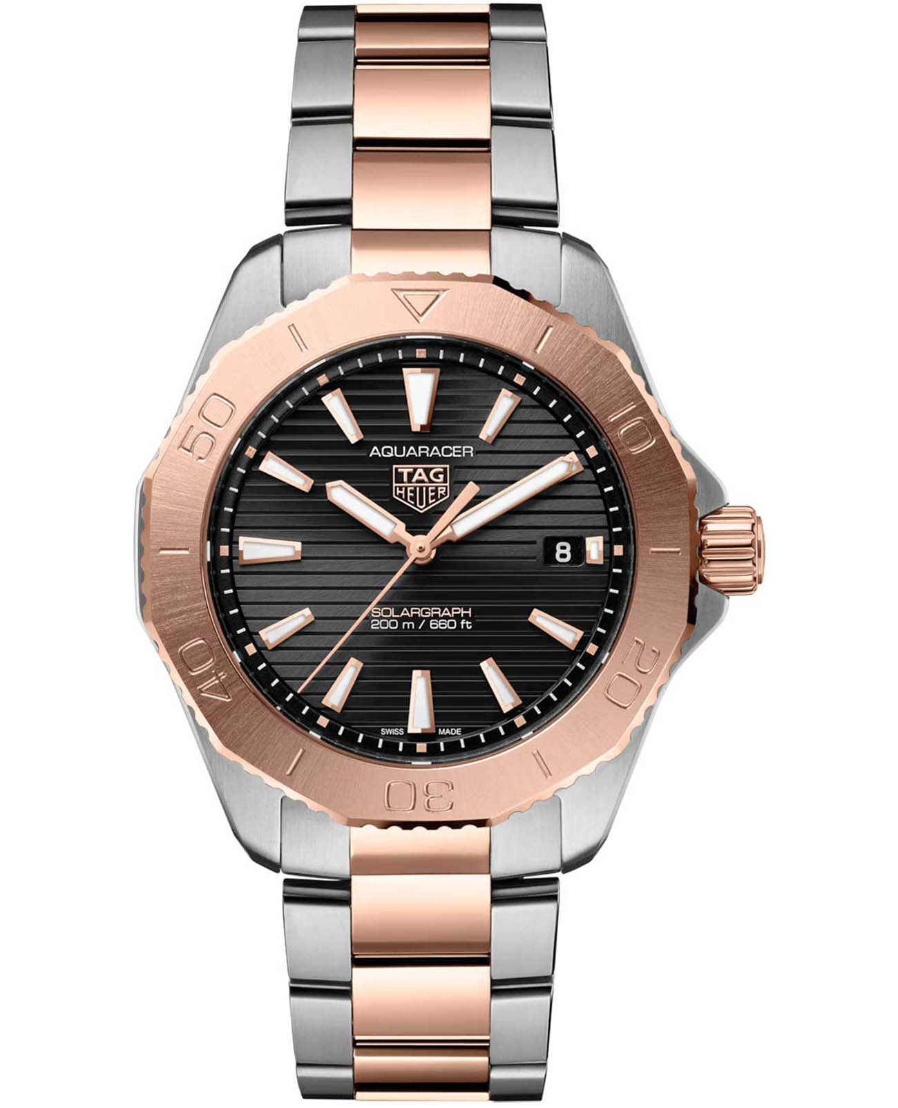 Часы TAG Heuer Aquaracer Professional 200 Solargraph WBP1121.BB0003. Высокая функциональность в нем сочетается с изысканной элегантностью, в то время как сапфировое стеклоСапфировое стеклоПрочный и надёжный материал из кристалла сапфира синтетического происхождения, характеризующийся особой твёрдостью и устойчивостью к царапинам и повреждениям. обеспечивает сверхточную разборчивость.Часы-хронографХронографФункция позволяет измерять отрезки времени с особой точностью: часы, минуты, секунды. Верным признаком хронографа является наличие на циферблате 3 дополнительных окошек-счётчиков.. Кварцевый механизм с высокой точностью. Класс водозащиты: 200 метров, позволит плавать, нырять и заниматься другими водными видами спорта. Часы с люминесцентным покрытиемЛюминесцентное покрытиеПозволяет считывать показания времени в темноте. Производители наносят на стрелки, часовые индексы, безель или поверхность циферблата светонакопительный состав, дающий холодное свечение. Superluminova. Корпус часов изготовлен из стали, безельБезельВнешний ободок, закрепляющий стекло. В спортивных часах так называется поворотное кольцо с делениями на циферблате, выполняет роль таймера – замеряет отрезки времени на шкале. Неподвижный безель – элемент декора. Однонаправленно вращающийся безель на дайверских часах позволяет фиксировать моменты погружения и выныривания на поверхность. из стали с 18-каратным золотом18-каратное золотоОбозначение по каратной системе пробирования, оно показывает, сколько драгоценного металла содержится в изделии. 18 карат - в составе 75% чистого золота, соответствует 750 пробе.