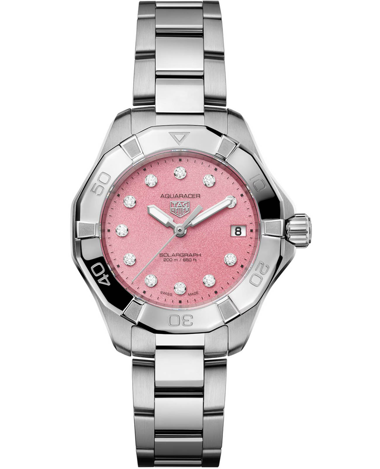 Женские кварцевые швейцарские часы TAG Heuer Aquaracer Professional 200 Solargraph WBP1318.BA0005, механизм с высокой точностью. Сапфировое стеклоСапфировое стеклоПрочный и надёжный материал из кристалла сапфира синтетического происхождения, характеризующийся особой твёрдостью и устойчивостью к царапинам и повреждениям. устойчивое к появлению царапин, обладающее высокой прозрачностью. Класс водозащиты: 200 метров, позволит плавать, нырять и заниматься другими водными видами спорта. Корпус часов и поворотный безельБезельВнешний ободок, закрепляющий стекло. В спортивных часах так называется поворотное кольцо с делениями на циферблате, выполняет роль таймера – замеряет отрезки времени на шкале. Неподвижный безель – элемент декора. Однонаправленно вращающийся безель на дайверских часах позволяет фиксировать моменты погружения и выныривания на поверхность. изготовлены из стали. Стальной браслет на раскладной застёжкеРаскладная застёжкаТакой тип застёжки используется только на браслетах из металла. Она никогда не раскрывается полностью, происходит разделение на 2 и более частей. Раскладывающая застёжка снизит вероятность потери часов к минимуму.. Изделие дополнено 11 бриллиантами VS в качестве часовых меток. Стрелки с люминесцентным покрытиемЛюминесцентное покрытиеПозволяет считывать показания времени в темноте. Производители наносят на стрелки, часовые индексы, безель или поверхность циферблата светонакопительный состав, дающий холодное свечение. Super-LumiNova. Окошко даты находится в положении 3 часов.