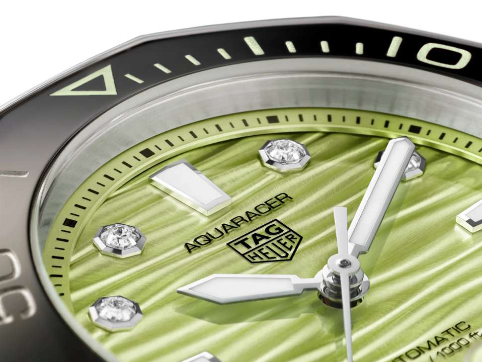 Женские механические швейцарские часы TAG Heuer Aquaracer Professional 300 Date WBP231L.BA0618, механический механизм (автоматический калибр) с Calibre 5 с высокой точностью. Циферблат пастельно-зеленого цвета, обрамленный контрастным черным керамическим безелем, отражает оттенки тропических вод. Сапфировое стеклоСапфировое стеклоПрочный и надёжный материал из кристалла сапфира синтетического происхождения, характеризующийся особой твёрдостью и устойчивостью к царапинам и повреждениям. устойчивое к появлению царапин, обладающее высокой прозрачностью. Класс водозащиты: 300 метров, позволит плавать, нырять и заниматься другими водными видами спорта. Корпус часов изготовлен из стали. Стальной браслет на раскладной застёжкеРаскладная застёжкаТакой тип застёжки используется только на браслетах из металла. Она никогда не раскрывается полностью, происходит разделение на 2 и более частей. Раскладывающая застёжка снизит вероятность потери часов к минимуму., что делает часы комфортными при ношении. Поворотный безельБезельВнешний ободок, закрепляющий стекло. В спортивных часах так называется поворотное кольцо с делениями на циферблате, выполняет роль таймера – замеряет отрезки времени на шкале. Неподвижный безель – элемент декора. Однонаправленно вращающийся безель на дайверских часах позволяет фиксировать моменты погружения и выныривания на поверхность. из стали и керамики. Изделие дополнено 8 бриллиантами VS+ в качестве часовых меток. Стрелки с люминесцентным покрытиемЛюминесцентное покрытиеПозволяет считывать показания времени в темноте. Производители наносят на стрелки, часовые индексы, безель или поверхность циферблата светонакопительный состав, дающий холодное свечение. Super-LumiNova®. Окошко даты находится в положении 6 часов. Эта модель – отличный выбор для тех, кто ищет сочетание стиля, качества и функциональности. Часы станут не только полезным аксессуаром, но и выразительным элементом вашего имиджа.