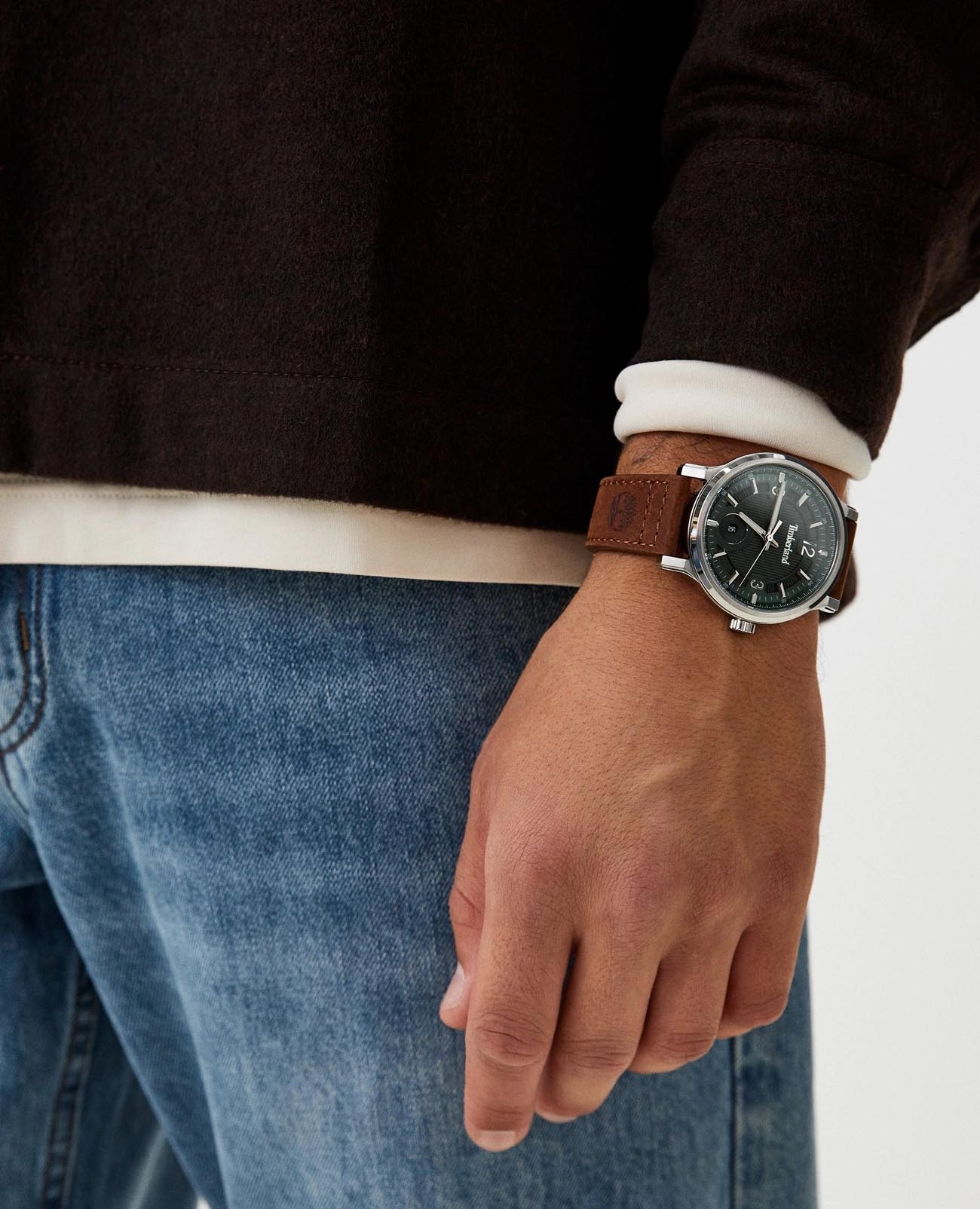 Американские мужские часы Timberland Driscoll TDWGB0055901 имеют кварцевый механизм с высокой точностью. Класс водозащиты: 50 метров, позволит защитить корпус от случайных брызг или капель дождя. Корпус часов изготовлен из стали. Прочное минеральное стеклоМинеральное стеклоМинеральное стекло представляет собой искусственно выращенный минерал кварца. Такое стекло отличается особой устойчивостью к повреждениям и царапинам. Уступает по некоторым качествам сапфировому стеклу.. Стрелки c люминесцентным покрытиемЛюминесцентное покрытиеПозволяет считывать показания времени в темноте. Производители наносят на стрелки, часовые индексы, безель или поверхность циферблата светонакопительный состав, дающий холодное свечение.. Кожаный ремешок с классической застежкой и системой быстрой замены. Окошко даты находится в положении 6 часов.