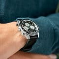 Модель оснащена кварцевым механизмом и функцией хронографа, включающей три дополнительных циферблата для отображения секунд, минут и 24-часового формата времени. Окно даты расположено между отметками 4 и 5 часов, что добавляет практичности в повседневной жизни.