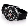 Броский хронографХронографФункция позволяет измерять отрезки времени с особой точностью: часы, минуты, секунды. Верным признаком хронографа является наличие на циферблате 3 дополнительных окошек-счётчиков. в спортивном стиле выразит ваше стремление двигаться только вперёд. Особенным является безельБезельВнешний ободок, закрепляющий стекло. В спортивных часах так называется поворотное кольцо с делениями на циферблате, выполняет роль таймера – замеряет отрезки времени на шкале. Неподвижный безель – элемент декора. Однонаправленно вращающийся безель на дайверских часах позволяет фиксировать моменты погружения и выныривания на поверхность. в необычной мотостилистике. Красная секундная стрелка добавляет динамичности. Каучуковый ремешок обеспечивает невероятный комфорт при ношении. Кварцевый механизм ETA G10.211 с высокой точностью хода. Сапфировое стекло. Корпус из хирургической стали 316L с чёрным PVD-покрытиемPVDУльтратонкое покрытие наносится в технике вакуумного напыления, сочетает в себе нитрид титана особой прочности со слоем золота или оксида хрома. Несёт в себе декоративную или защитную функцию.. Оригинальная задняя крышка в виде колеса. Водонепроницаемость 100 метров. Секундомер, тахиметрТахиметрРазмеченная шкала, располагается на ободке или безеле часов. Тахиметр позволяет рассчитать скорость на определённом участке пути, расстояние измеряется в километрах или милях., апертура даты. Габариты: 50,2 x 45,3 x 12,2 мм.