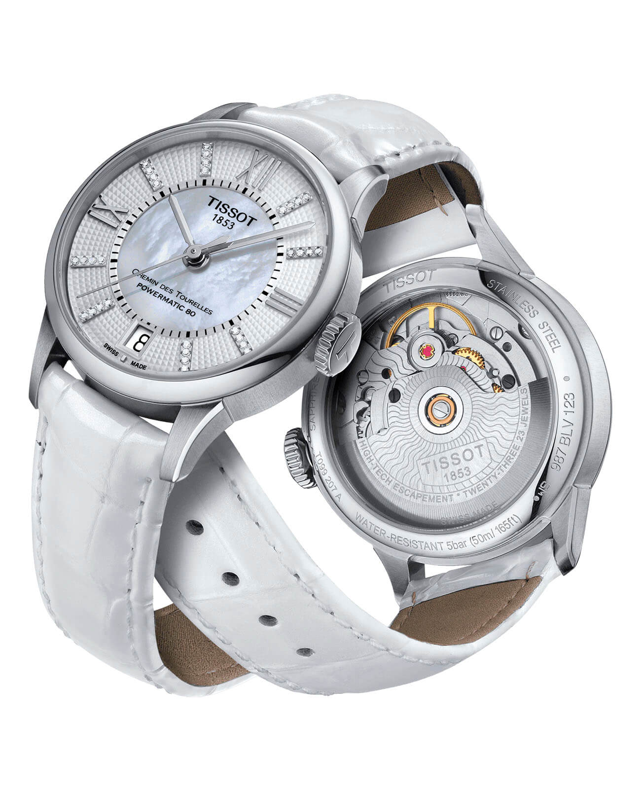 Утончённая модель имеет действительно шикарное исполнение циферблата с римскими цифрами, где лаконичность переплетается с великолепием и изяществом. По окружности он дополнен характерным для линейки узором, в середине расположена вставка из белого перламутра. Циферблат инкрустирован 32 бриллиантами цвета Top Wesselton в 0, 064 карат, их сияние никого не оставит равнодушным. Внутри корпуса из нержавеющей стали 316L находится автоматический механизм ETA Powermatic 80Powermatic 80Эксклюзивный калибр от швейцарской компании ETA с увеличенным запасом хода до 80 часов за счёт удлинённой заводной пружины. Характеризуется улучшенной системой спуска со сниженным трением. с запасом хода 80 часов. Движения деталей прослеживаются сквозь прозрачную заднюю крышку, оформленную узором «женевские волны». Стекло из сапфира с двусторонней антибликовой обработкой. Водонепроницаемость до 5 бар. . Апертура даты. Габариты: 32 x 32 x 10,7 мм.