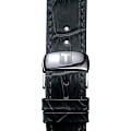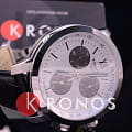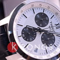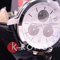 Модель сочетает в себе белый, чёрный, серебристый цвет, подобное исполнение позволяет носить их даже с одеждой самых смелых оттенков. Секундная стрелка выполнена в виде шпаги, необычный узор украшает массивный циферблат с дополнительными счётчиками хронографаХронографФункция позволяет измерять отрезки времени с особой точностью: часы, минуты, секунды. Верным признаком хронографа является наличие на циферблате 3 дополнительных окошек-счётчиков.. Кварцевый калибр ETA G10.211 с 4 камнями. Ремешок из натуральной кожи с тиснением под кожу крокодила. Стальной ударопрочный корпус. Хронограф, тахиметрТахиметрРазмеченная шкала, располагается на ободке или безеле часов. Тахиметр позволяет рассчитать скорость на определённом участке пути, расстояние измеряется в километрах или милях., секундомер, дата. Габариты: 41 x 42 x 12 мм.
