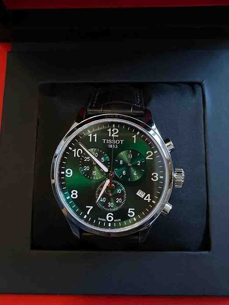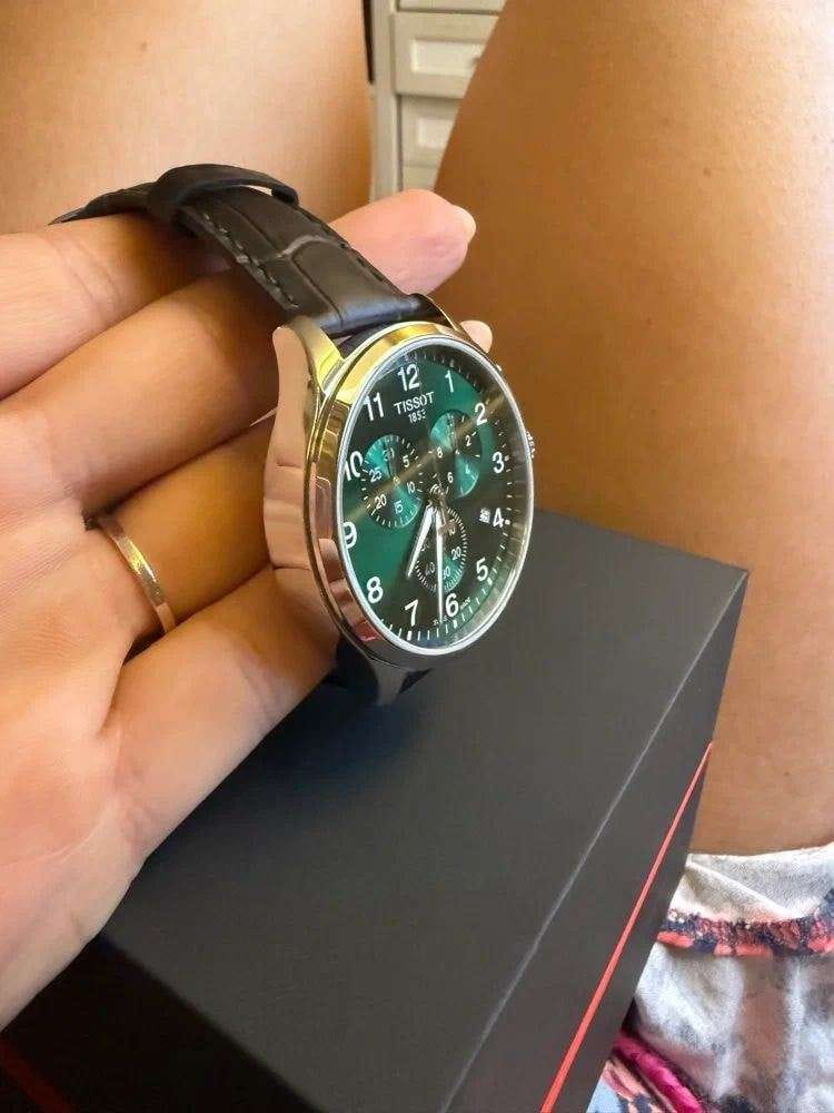 Мужские наручные часы-хронографХронографФункция позволяет измерять отрезки времени с особой точностью: часы, минуты, секунды. Верным признаком хронографа является наличие на циферблате 3 дополнительных окошек-счётчиков. Tissot T116.617.16.092.00 из коллекции Chrono XL Classic сочетают в себе спортивный стиль и точность швейцарского производства. Модель обладает круглым корпусом диаметром 45 мм, изготовленным из нержавеющей стали, что обеспечивает высокую устойчивость к внешним воздействиям [[7]]. Браслет выполнен из коричневой кожи на стандартной застежке, гарантирующей комфортное ношение и безопасность. Зеленый циферблат оснащен окном даты, расположенным на позиции «6 часов». Для защиты используется сапфировое стеклоСапфировое стеклоПрочный и надёжный материал из кристалла сапфира синтетического происхождения, характеризующийся особой твёрдостью и устойчивостью к царапинам и повреждениям., обеспечивающее прочную защиту от царапин и антибликовый эффект. Часы работают на кварцевом механизме ETA G10.212, что гарантирует точное время без необходимости подзаводки. Модель также является хронографом, оснащенным функцией секундомераСекундомерСекундоме́р — прибор, способный измерять интервалы времени с точностью до долей секунды., делая ее идеальной для активного образа жизни. Водонепроницаемость часов достигает 10 атмосфер (100 метров), что позволяет использовать их во время плавания и других водных видов спорта, однако не рекомендуется для глубоководного дайвинга.