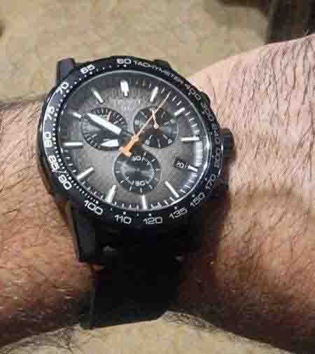 Современный хронографХронографФункция позволяет измерять отрезки времени с особой точностью: часы, минуты, секунды. Верным признаком хронографа является наличие на циферблате 3 дополнительных окошек-счётчиков. поможет подчеркнуть продуманный образ делового мужчины. Модель выполнена в спокойной тёмной расцветке. Спортивный дух выражается в коричневом ремешке из натуральной кожи с прострочкой, чёрном безелеБезельВнешний ободок, закрепляющий стекло. В спортивных часах так называется поворотное кольцо с делениями на циферблате, выполняет роль таймера – замеряет отрезки времени на шкале. Неподвижный безель – элемент декора. Однонаправленно вращающийся безель на дайверских часах позволяет фиксировать моменты погружения и выныривания на поверхность. со шкалой тахиметраТахиметрРазмеченная шкала, располагается на ободке или безеле часов. Тахиметр позволяет рассчитать скорость на определённом участке пути, расстояние измеряется в километрах или милях.. Наручные часы функционируют благодаря швейцарскому кварцевому механизму ETA G10.212. Калибр отличается максимальной точностью хода. Стекло из сапфира. Водостойкость 100 метров. Надёжный корпус из антикоррозионной стали 316L с чёрным PVD-покрытиемPVDУльтратонкое покрытие наносится в технике вакуумного напыления, сочетает в себе нитрид титана особой прочности со слоем золота или оксида хрома. Несёт в себе декоративную или защитную функцию.. Люминесцентная подсветкаЛюминесцентное покрытиеПозволяет считывать показания времени в темноте. Производители наносят на стрелки, часовые индексы, безель или поверхность циферблата светонакопительный состав, дающий холодное свечение. стрелок и индексов. Секундомер, отображение даты. Диаметр корпуса: 45,5 мм.