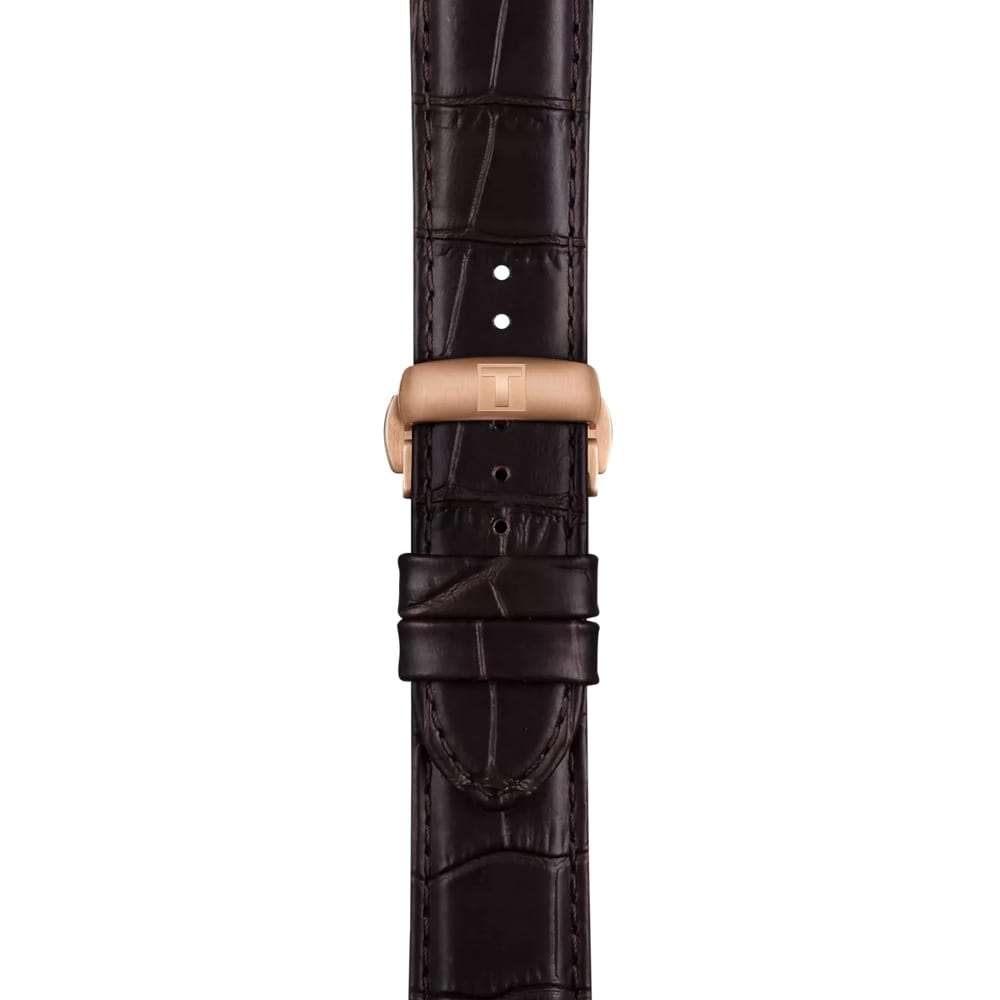 Tissot Chemin des Tourelles Automatic Chronograph (модель T139.462.36.298.00) – это элегантность и технологичность в одном аксессуаре. Корпус диаметром 42 мм выполнен из нержавеющей стали 316L с изысканным PVD-покрытиемPVDУльтратонкое покрытие наносится в технике вакуумного напыления, сочетает в себе нитрид титана особой прочности со слоем золота или оксида хрома. Несёт в себе декоративную или защитную функцию. в цвете розового золота, подчёркивающим статусность модели. Коричневый циферблат с римскими цифрами дополнен классическими стрелками, а его поверхность защищена сапфировым стекломСапфировое стеклоПрочный и надёжный материал из кристалла сапфира синтетического происхождения, характеризующийся особой твёрдостью и устойчивостью к царапинам и повреждениям. с антибликовым покрытиемАнтибликовое покрытиеСлой оксида металла в 0,13-0,3 микрон, благодаря которому стекло часов не бликует и не отражает свет. Антибликовое покрытие уменьшает отражение света в 10 раз, обеспечивая отличную читаемость показателей циферблата., обеспечивающим идеальную читаемость при любом освещении. Внутри скрывается надёжный автоматический калибр ValjouxValjouxПремиальный калибр от швейцарской компании ETA c уникальной отделкой механизма. Отличается увеличенным запасом хода от 45 до 60 часов, в зависимости от калибра, точность хода составляет +/- 5 секунд в сутки. с 68-часовым запасом хода. Функциональность модели дополняет хронографХронографФункция позволяет измерять отрезки времени с особой точностью: часы, минуты, секунды. Верным признаком хронографа является наличие на циферблате 3 дополнительных окошек-счётчиков. с 12-часовым, 30-минутным и 60-секундным счётчиками, а также центральной секундной стрелкой. Браслет из коричневой кожи завершает образ, а надёжная застёжка 'бабочка'Застёжка "бабочка"Такой вид застёжки дополняется предохранителями, помогающими избежать случайного раскрытия браслета. Обладают изящным исполнением. обеспечивает комфортное ношение. Водонепроницаемость 5 бар (50 метров) делает модель устойчивой к случайным брызгам и дождю.