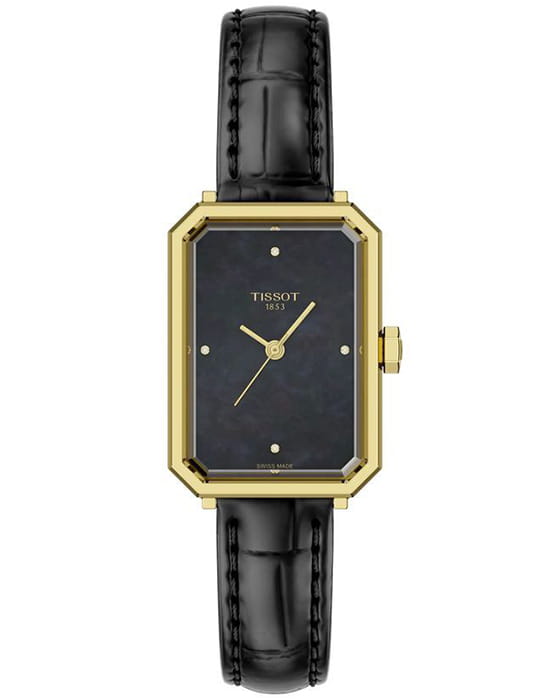 Tissot SRV 30mm — утончённая модель в винтажном стиле с элегантным акцентом. Корпус прямоугольной формы украшен PVDPVDУльтратонкое покрытие наносится в технике вакуумного напыления, сочетает в себе нитрид титана особой прочности со слоем золота или оксида хрома. Несёт в себе декоративную или защитную функцию.-покрытием в оттенке жёлтого золота, что придаёт часам благородный облик. Чёрный циферблат с лаконичными метками в виде точек подчёркивает минималистичный характер модели, а за точность отвечает швейцарский кварцевый механизм. Циферблат защищён сапфировым стекломСапфировое стеклоПрочный и надёжный материал из кристалла сапфира синтетического происхождения, характеризующийся особой твёрдостью и устойчивостью к царапинам и повреждениям., стойким к царапинам. Часы дополнены кожаным ремешком с классической пряжкой, что обеспечивает комфортную посадку на запястье и гармонично завершает дизайн.