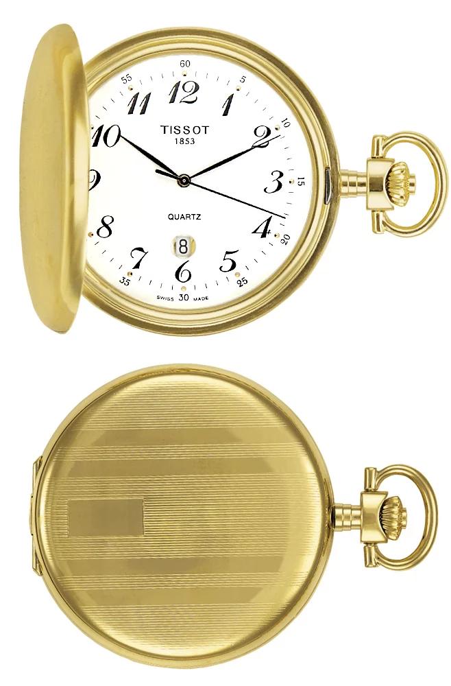 Карманные швейцарские часы Tissot T-Pocket Savonnette T83.4.553.12, кварцевый механизм. Круглый латунный корпус, защищенный минеральным стекломМинеральное стеклоМинеральное стекло представляет собой искусственно выращенный минерал кварца. Такое стекло отличается особой устойчивостью к повреждениям и царапинам. Уступает по некоторым качествам сапфировому стеклу.. Класс водозащиты: 30 метров, позволит защитить корпус от случайных брызг или капель дождя. Окошко даты находится в положении 6 часов.