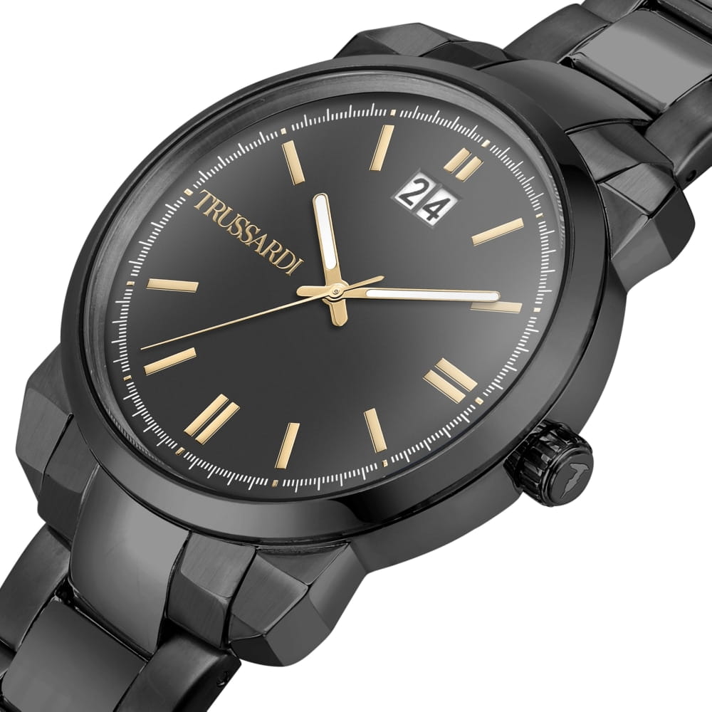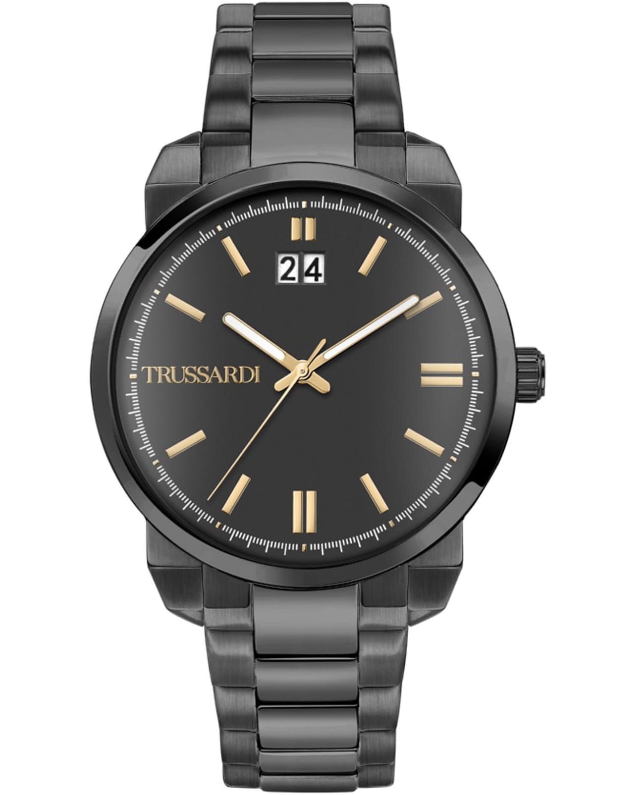 Итальянские мужские часы Trussardi T-City R2453154004 - это стильный мужской аксессуар, который сочетает элегантный дизайн и практичность. Корпус выполнен из нержавеющей стали с IP-покрытиемIP-покрытиеМетод ионного напыления. Демонстрирует повышенную устойчивость к истиранию, окислению и химическим веществам. Под воздействием высокого давления и температуры около 1500°C молекулы металла надёжно соединяются с частицами корпуса часов., что обеспечивает долговечность и утончённый внешний вид. Надежное минеральное стеклоМинеральное стеклоМинеральное стекло представляет собой искусственно выращенный минерал кварца. Такое стекло отличается особой устойчивостью к повреждениям и царапинам. Уступает по некоторым качествам сапфировому стеклу. защищает циферблат от царапин и обеспечивает долговечность. Модель оснащена кварцевым механизмом, обеспечивающим высокую точность хода. Браслет из нержавеющей стали с IP-покрытиемIP-покрытиеМетод ионного напыления. Демонстрирует повышенную устойчивость к истиранию, окислению и химическим веществам. Под воздействием высокого давления и температуры около 1500°C молекулы металла надёжно соединяются с частицами корпуса часов. с раскладной застёжкойРаскладная застёжкаТакой тип застёжки используется только на браслетах из металла. Она никогда не раскрывается полностью, происходит разделение на 2 и более частей. Раскладывающая застёжка снизит вероятность потери часов к минимуму. обеспечивает комфортное ношение. Водозащита 50 метров позволит защитить корпус от случайных брызг или капель дождя. Стрелки оснащены люминесцентным покрытиемЛюминесцентное покрытиеПозволяет считывать показания времени в темноте. Производители наносят на стрелки, часовые индексы, безель или поверхность циферблата светонакопительный состав, дающий холодное свечение., обеспечивающим отличную видимость даже при слабом освещении. Окошко даты в положении 12 часов. Эта модель – отличный выбор для тех, кто ищет сочетание стиля, качества и функциональности. Часы станут не только полезным аксессуаром, но и выразительным элементом вашего имиджа. В наборе с часами идет кожаная кредитница.