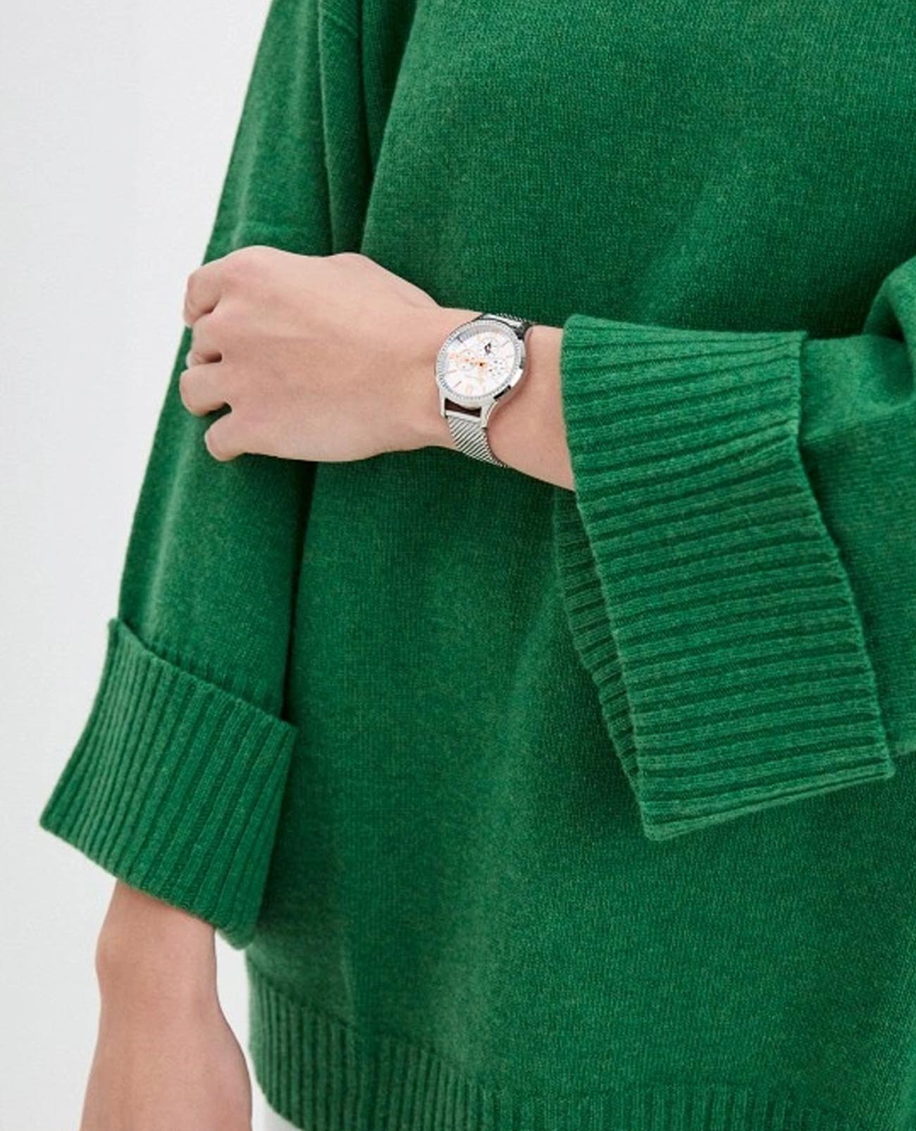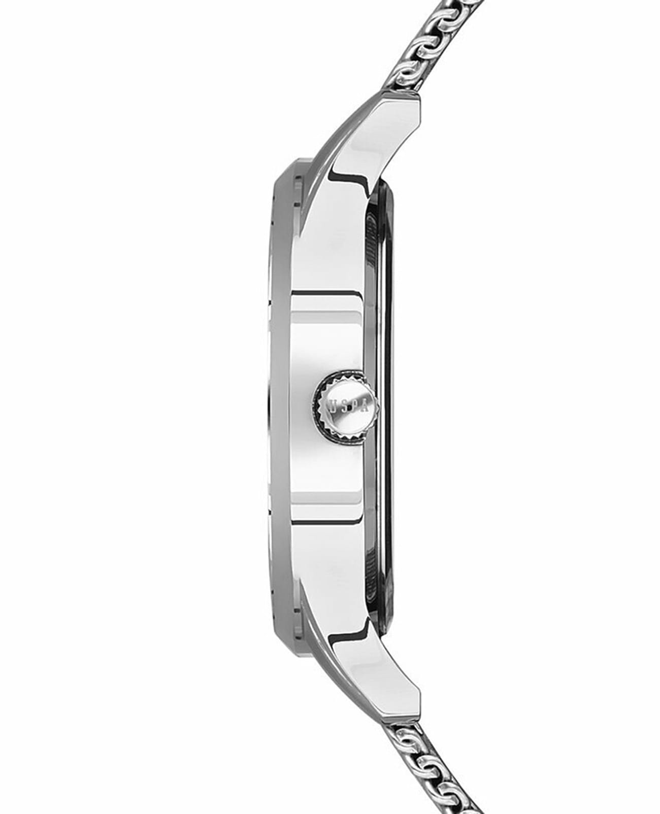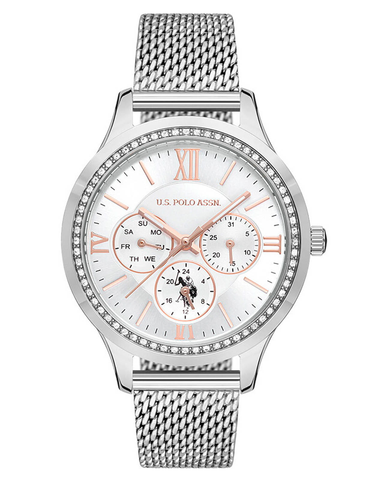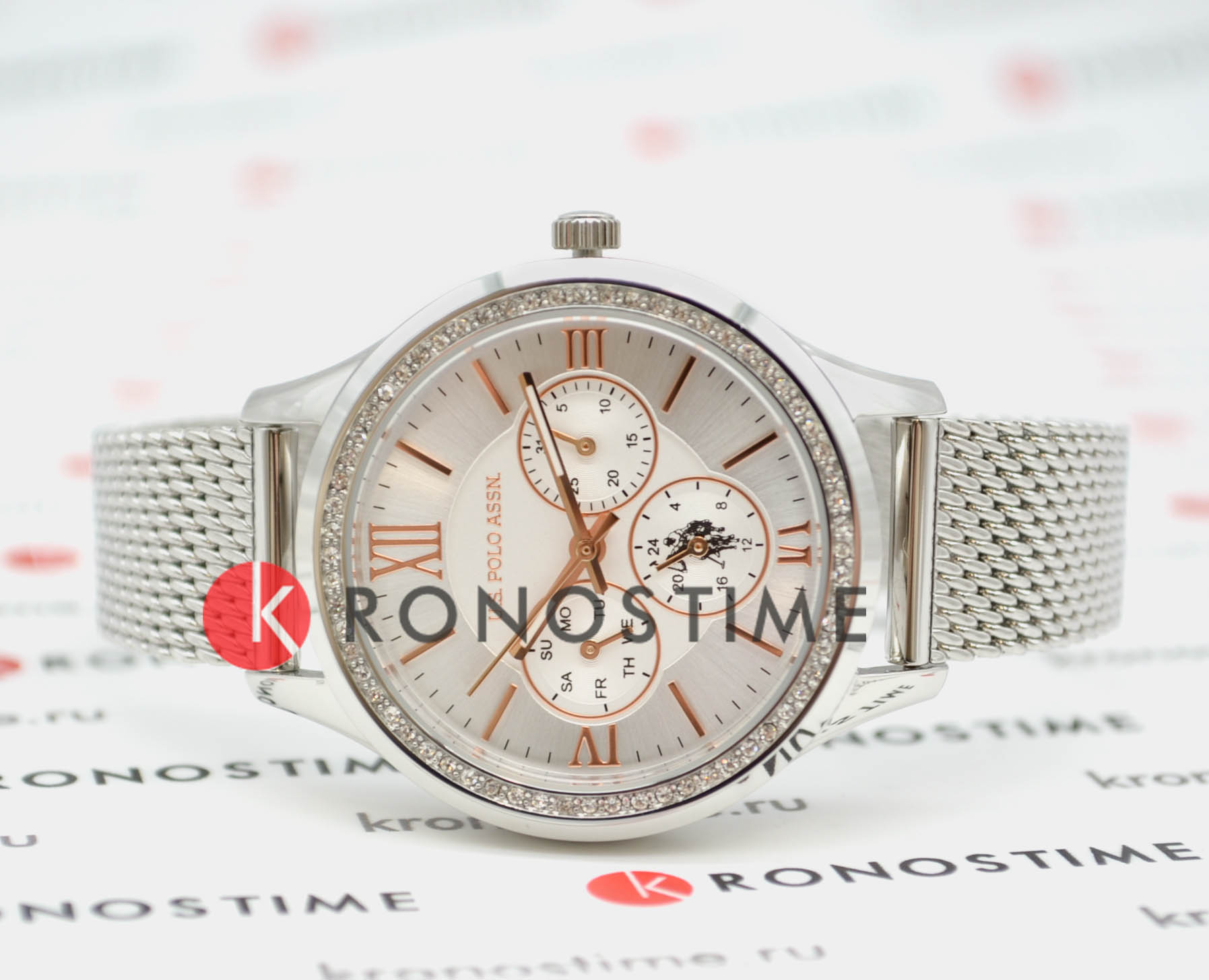 Женские часы U.S. Polo Assn. Stile USPA2022-02, кварцевый механизм с высокой точностью. Минеральное стеклоМинеральное стеклоМинеральное стекло представляет собой искусственно выращенный минерал кварца. Такое стекло отличается особой устойчивостью к повреждениям и царапинам. Уступает по некоторым качествам сапфировому стеклу. устойчивое к появлению царапин, обладающее высокой прозрачностью. Центральные часовая, минутная и секундная стрелки. Индикация даты и дня недели. 12/24х часовой формат времени. Корпус и браслет изготовлены из нержавеющей стали. На циферблате три дополнительных индикатора. Стрелки с люминесцентным покрытиемЛюминесцентное покрытиеПозволяет считывать показания времени в темноте. Производители наносят на стрелки, часовые индексы, безель или поверхность циферблата светонакопительный состав, дающий холодное свечение.. Часы украшены кристаллами. Класс водозащиты: 50 метров, позволит защитить корпус от случайных брызг или капель дождя. Стальной браслет миланского плетения на раскладной застёжкеРаскладная застёжкаТакой тип застёжки используется только на браслетах из металла. Она никогда не раскрывается полностью, происходит разделение на 2 и более частей. Раскладывающая застёжка снизит вероятность потери часов к минимуму..