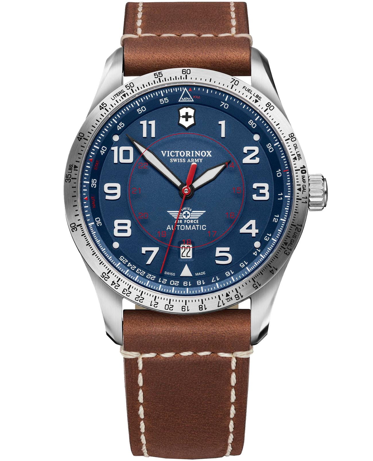 Мужские механические часы Victorinox AirBoss 241887. Корпус часов изготовлен из нержавеющей стали. Сапфировое стеклоСапфировое стеклоПрочный и надёжный материал из кристалла сапфира синтетического происхождения, характеризующийся особой твёрдостью и устойчивостью к царапинам и повреждениям. с тройным антибликовым покрытием. Практичный кожаный ремешок с раскладной застёжкойРаскладная застёжкаТакой тип застёжки используется только на браслетах из металла. Она никогда не раскрывается полностью, происходит разделение на 2 и более частей. Раскладывающая застёжка снизит вероятность потери часов к минимуму.. Стрелки и метки с люминесцентным покрытиемЛюминесцентное покрытиеПозволяет считывать показания времени в темноте. Производители наносят на стрелки, часовые индексы, безель или поверхность циферблата светонакопительный состав, дающий холодное свечение.. БезельБезельВнешний ободок, закрепляющий стекло. В спортивных часах так называется поворотное кольцо с делениями на циферблате, выполняет роль таймера – замеряет отрезки времени на шкале. Неподвижный безель – элемент декора. Однонаправленно вращающийся безель на дайверских часах позволяет фиксировать моменты погружения и выныривания на поверхность. с логарифмической линейкой. Эта функция позволяет измерять такие метрические параметры, как объем, скорость, расстояние и расход топлива, и конвертировать различные переменные. Окошко даты находится в положении 6 часов.