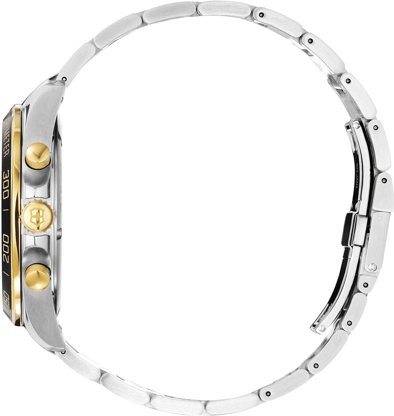 Мужские швейцарские часы-хронографХронографФункция позволяет измерять отрезки времени с особой точностью: часы, минуты, секунды. Верным признаком хронографа является наличие на циферблате 3 дополнительных окошек-счётчиков. Victorinox Fieldforce Chronograph 241903 с надёжным кварцевым механизмом. Сапфировое стеклоСапфировое стеклоПрочный и надёжный материал из кристалла сапфира синтетического происхождения, характеризующийся особой твёрдостью и устойчивостью к царапинам и повреждениям. с трёхслойным антибликовым покрытием. Корпус часов выполнен из нержавеющей стали 316L. Стальной браслет с частичным PVD-покрытиемPVDУльтратонкое покрытие наносится в технике вакуумного напыления, сочетает в себе нитрид титана особой прочности со слоем золота или оксида хрома. Несёт в себе декоративную или защитную функцию. на раскладной застёжкеРаскладная застёжкаТакой тип застёжки используется только на браслетах из металла. Она никогда не раскрывается полностью, происходит разделение на 2 и более частей. Раскладывающая застёжка снизит вероятность потери часов к минимуму.. Влагозащита: 100 метров, позволит плавать, нырять и заниматься другими водными видами спорта. Окошко даты находится в положении 6 часов, стрелки и метки с люминесцентным покрытиемЛюминесцентное покрытиеПозволяет считывать показания времени в темноте. Производители наносят на стрелки, часовые индексы, безель или поверхность циферблата светонакопительный состав, дающий холодное свечение., тахиметрТахиметрРазмеченная шкала, располагается на ободке или безеле часов. Тахиметр позволяет рассчитать скорость на определённом участке пути, расстояние измеряется в километрах или милях..