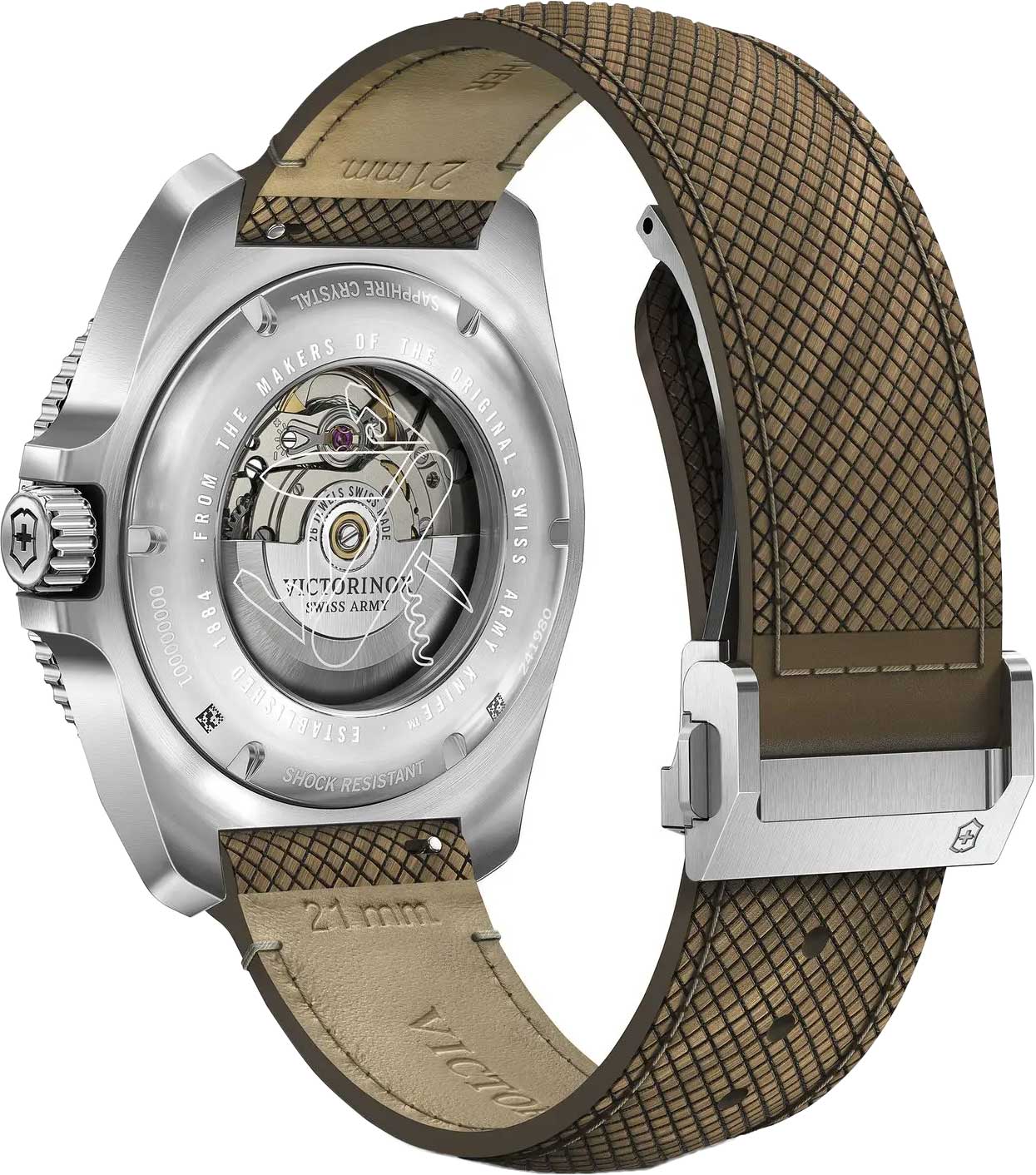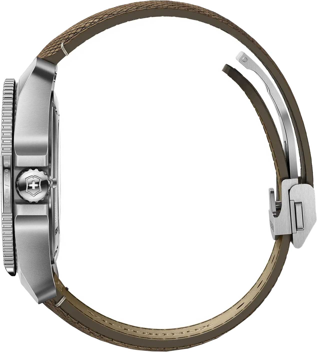 Мужские швейцарские часы Victorinox 241980.1. Сапфировое стеклоСапфировое стеклоПрочный и надёжный материал из кристалла сапфира синтетического происхождения, характеризующийся особой твёрдостью и устойчивостью к царапинам и повреждениям. с трёхслойным антибликовым покрытием. Корпус часов выполнен из титана. Влагозащита: 200 метров, позволит плавать, нырять и заниматься другими водными видами спорта. Стрелки и метки с люминесцентным покрытиемЛюминесцентное покрытиеПозволяет считывать показания времени в темноте. Производители наносят на стрелки, часовые индексы, безель или поверхность циферблата светонакопительный состав, дающий холодное свечение.. В комплекте съемный защитный бампер. В комплекте сменный силиконовый ремешок. Окошко даты находится в положении 6 часов. БезельБезельВнешний ободок, закрепляющий стекло. В спортивных часах так называется поворотное кольцо с делениями на циферблате, выполняет роль таймера – замеряет отрезки времени на шкале. Неподвижный безель – элемент декора. Однонаправленно вращающийся безель на дайверских часах позволяет фиксировать моменты погружения и выныривания на поверхность. с PVD-покрытиемPVDУльтратонкое покрытие наносится в технике вакуумного напыления, сочетает в себе нитрид титана особой прочности со слоем золота или оксида хрома. Несёт в себе декоративную или защитную функцию..