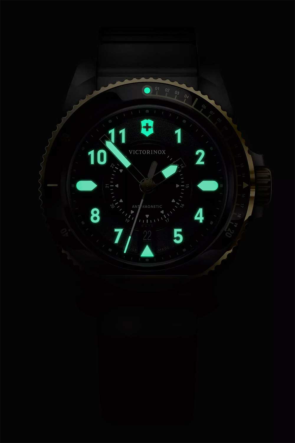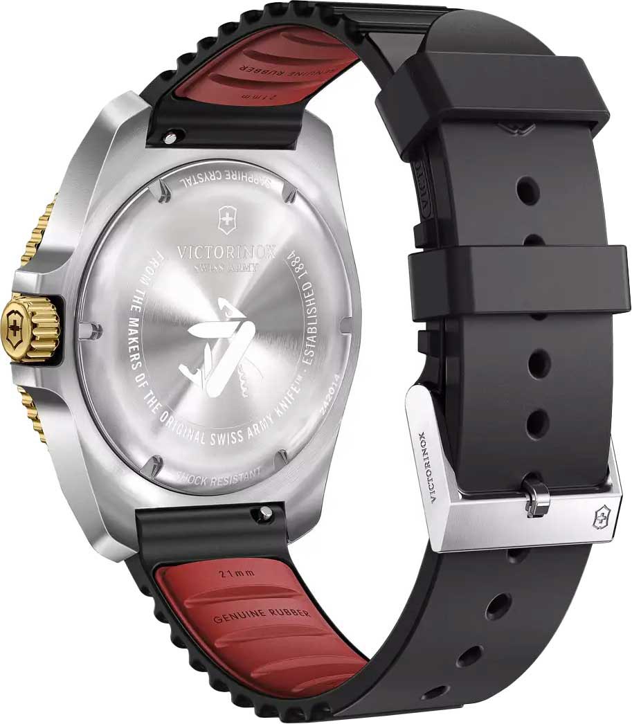 Мужские швейцарские часы Victorinox 242014. Сапфировое стеклоСапфировое стеклоПрочный и надёжный материал из кристалла сапфира синтетического происхождения, характеризующийся особой твёрдостью и устойчивостью к царапинам и повреждениям. с трёхслойным антибликовым покрытием. Корпус часов выполнен из стали. Влагозащита: 200 метров, позволит плавать, нырять и заниматься другими водными видами спорта. Стрелки и метки с люминесцентным покрытиемЛюминесцентное покрытиеПозволяет считывать показания времени в темноте. Производители наносят на стрелки, часовые индексы, безель или поверхность циферблата светонакопительный состав, дающий холодное свечение.. Окошко даты находится в положении 6 часов. БезельБезельВнешний ободок, закрепляющий стекло. В спортивных часах так называется поворотное кольцо с делениями на циферблате, выполняет роль таймера – замеряет отрезки времени на шкале. Неподвижный безель – элемент декора. Однонаправленно вращающийся безель на дайверских часах позволяет фиксировать моменты погружения и выныривания на поверхность. с PVD-покрытиемPVDУльтратонкое покрытие наносится в технике вакуумного напыления, сочетает в себе нитрид титана особой прочности со слоем золота или оксида хрома. Несёт в себе декоративную или защитную функцию.. Ремешок с классической застежкой и системой быстрой замены.