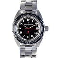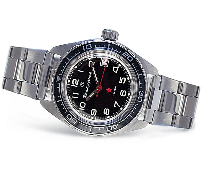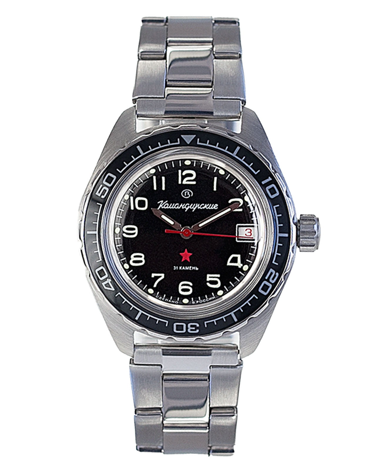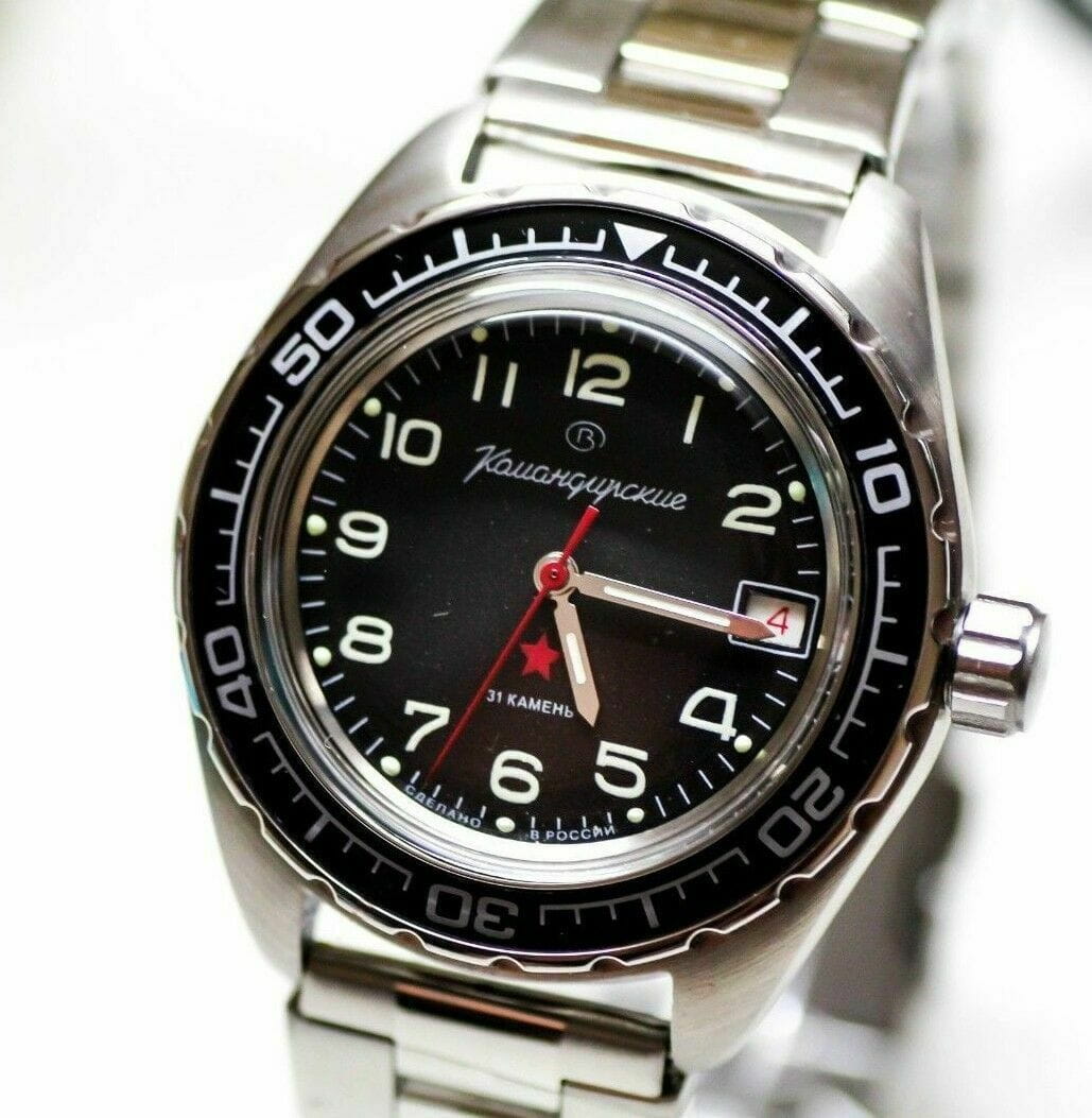 Мужские российские механические наручные часы Восток Командирские 020706, механический механизм (автоматический калибр) с высокой точностью. Класс водозащиты: 200 метров, позволит плавать, нырять и заниматься другими водными видами спорта. Стрелки с люминесцентным покрытиемЛюминесцентное покрытиеПозволяет считывать показания времени в темноте. Производители наносят на стрелки, часовые индексы, безель или поверхность циферблата светонакопительный состав, дающий холодное свечение.. Вращающийся безельБезельВнешний ободок, закрепляющий стекло. В спортивных часах так называется поворотное кольцо с делениями на циферблате, выполняет роль таймера – замеряет отрезки времени на шкале. Неподвижный безель – элемент декора. Однонаправленно вращающийся безель на дайверских часах позволяет фиксировать моменты погружения и выныривания на поверхность. из нержавеющей стали с PVDPVDУльтратонкое покрытие наносится в технике вакуумного напыления, сочетает в себе нитрид титана особой прочности со слоем золота или оксида хрома. Несёт в себе декоративную или защитную функцию. покрытием. Окошко даты находится в положении 3 часа. Автоподзавод с предохранительным устройством от перезаводки пружины. Частота: 19800 полуколебаний/час. Браслет с раскладной застёжкойРаскладная застёжкаТакой тип застёжки используется только на браслетах из металла. Она никогда не раскрывается полностью, происходит разделение на 2 и более частей. Раскладывающая застёжка снизит вероятность потери часов к минимуму..