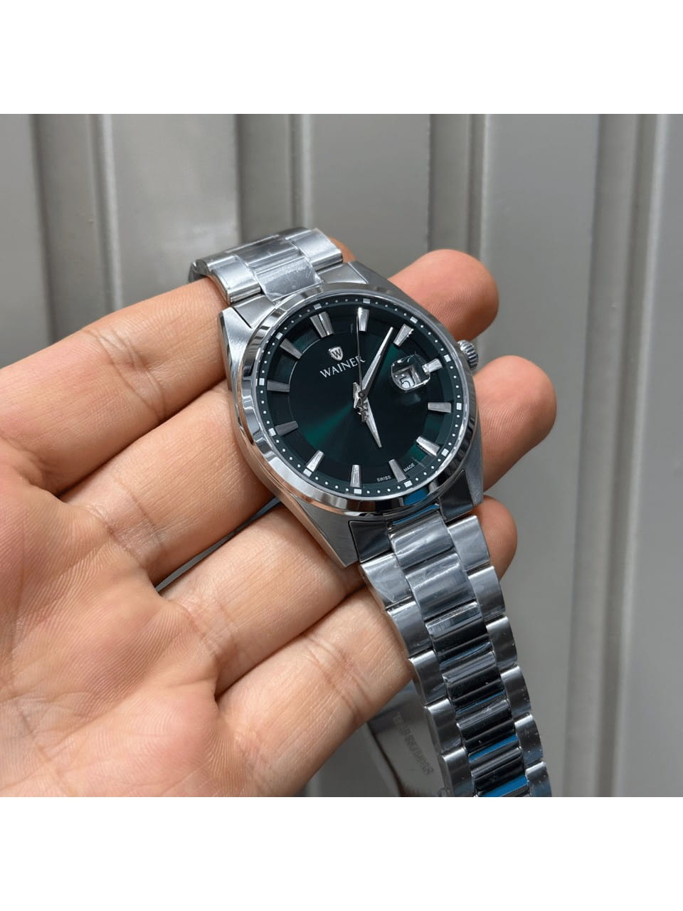 Мужские кварцевые часы WA.17200-E сочетают в себе элегантный дизайн и высокое качество исполнения. Корпус выполнен из нержавеющей стали серебристого цвета диаметром 41 мм, обеспечивает прочность и долговечность. Циферблат с метками в виде штрихов выполнен по технологии Sunray (солнечные лучи) и украшен фирменным логотипом Wainer. Сапфировое стеклоСапфировое стеклоПрочный и надёжный материал из кристалла сапфира синтетического происхождения, характеризующийся особой твёрдостью и устойчивостью к царапинам и повреждениям. защищает дисплей от царапин и механических повреждений. Окошко даты находится в положении 3 часа. Стрелки с люминесцентным покрытиемЛюминесцентное покрытиеПозволяет считывать показания времени в темноте. Производители наносят на стрелки, часовые индексы, безель или поверхность циферблата светонакопительный состав, дающий холодное свечение., улучшая читаемость в условиях недостаточного освещения. Стальной браслет на застёжке-бабочкеЗастёжка "бабочка"Такой вид застёжки дополняется предохранителями, помогающими избежать случайного раскрытия браслета. Обладают изящным исполнением. обеспечивает комфортное ношение на запястье. Водонепроницаемость до 50 метров позволит защитить корпус от случайных брызг или капель дождя. Wainer — это стильный и надежный аксессуар для тех, кто ценит швейцарское качество и современные технологии.
