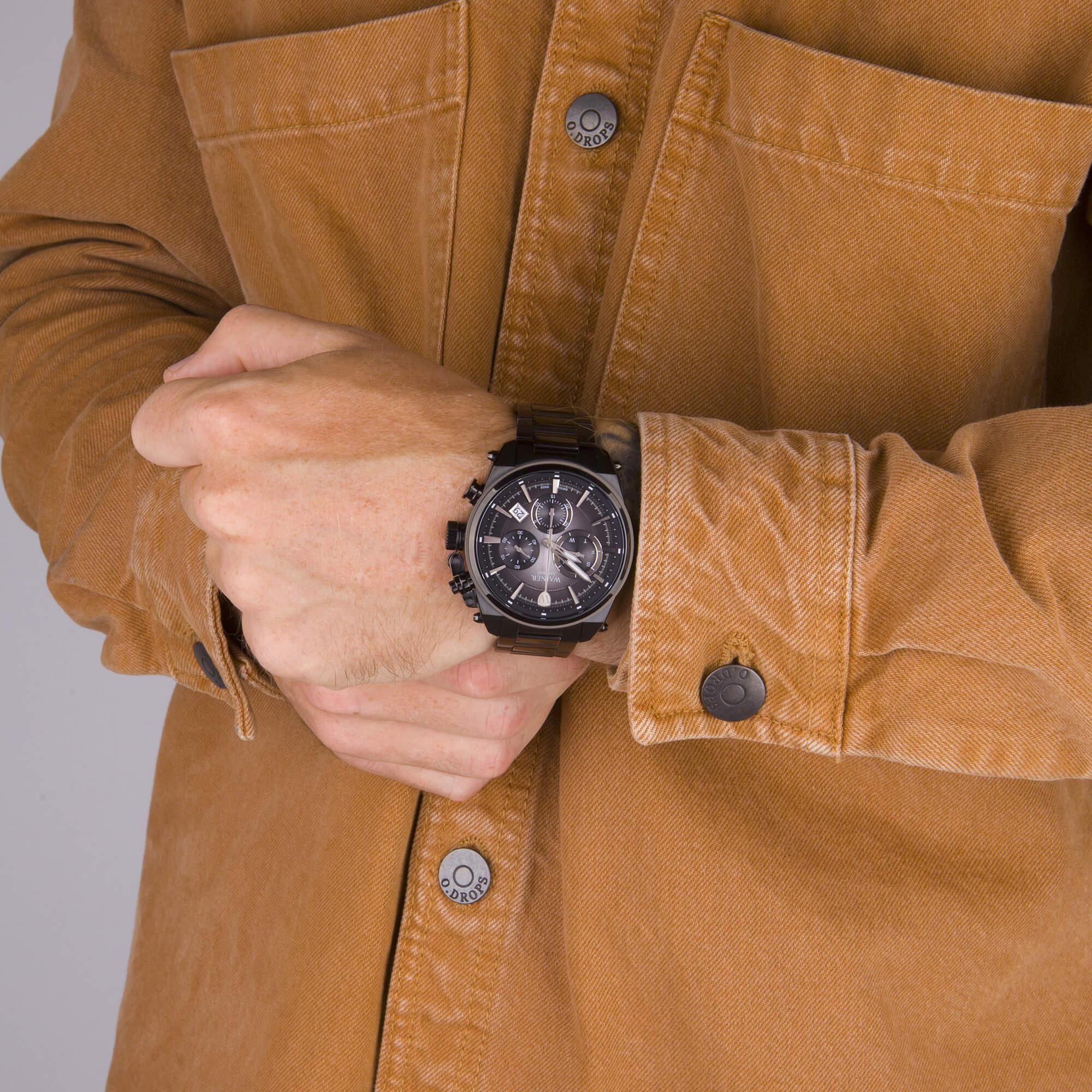 Wainer WA.19200-D – элегантные швейцарские часы, сочетающие современный дизайн с высококачественными материалами. Корпус и браслет выполнены из нержавеющей стали 316L с PVDPVDУльтратонкое покрытие наносится в технике вакуумного напыления, сочетает в себе нитрид титана особой прочности со слоем золота или оксида хрома. Несёт в себе декоративную или защитную функцию.-покрытием, придающим глубокий чёрный оттенок и повышенную стойкость к износу. Сапфировое стеклоСапфировое стеклоПрочный и надёжный материал из кристалла сапфира синтетического происхождения, характеризующийся особой твёрдостью и устойчивостью к царапинам и повреждениям. обеспечивает защиту от царапин и кристальную прозрачность, сохраняя безупречную читаемость чёрного циферблата. Функциональность дополняется хронографомХронографФункция позволяет измерять отрезки времени с особой точностью: часы, минуты, секунды. Верным признаком хронографа является наличие на циферблате 3 дополнительных окошек-счётчиков. для точного измерения времени и индикатором даты для удобства. Водонепроницаемость 100 метров позволяет использовать часы при повседневном ношении и лёгких водных активностях.