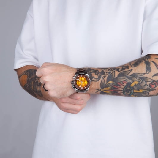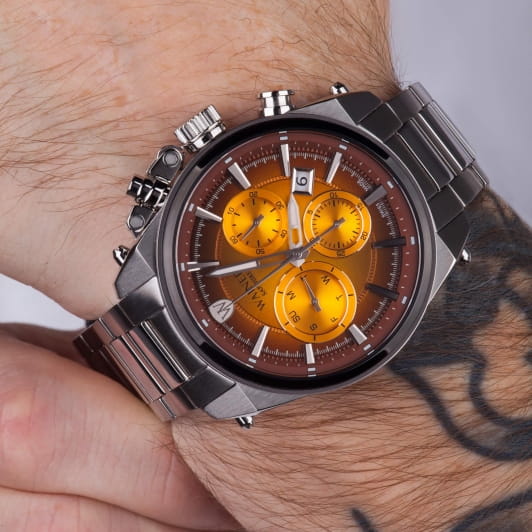 Wainer WA.19200-F – элегантные швейцарские часы, сочетающие современный дизайн с высококачественными материалами. Корпус из нержавеющей стали диаметром 46 мм придаёт модели прочность и стильный внешний вид. Сапфировое стеклоСапфировое стеклоПрочный и надёжный материал из кристалла сапфира синтетического происхождения, характеризующийся особой твёрдостью и устойчивостью к царапинам и повреждениям. обеспечивает защиту от царапин и кристальную прозрачность, сохраняя безупречную читаемость циферблата. Функциональность дополняется хронографомХронографФункция позволяет измерять отрезки времени с особой точностью: часы, минуты, секунды. Верным признаком хронографа является наличие на циферблате 3 дополнительных окошек-счётчиков. для точного измерения времени и индикатором даты для удобства. Водонепроницаемость 100 метров делает модель подходящей для плавания и других водных активностей, сочетая надёжность и утончённый стиль.