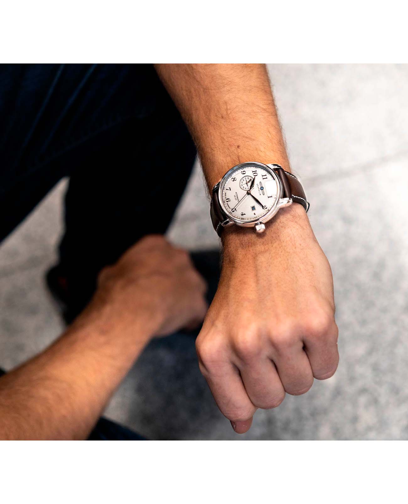 Мужские наручные часы Zeppelin 86684 из коллекции LZ127 Graf Zeppelin сочетают в себе классический дизайн и надежность современных технологий. Модель обладает круглым корпусом диаметром 40 мм, изготовленным из нержавеющей стали, что обеспечивает высокую устойчивость к внешним воздействиям. Браслет выполнен из кожи, гарантирующей комфортное ношение. Белый циферблат оснащен индикаторами часов, минут и секунд, а также окном даты. Для защиты используется минеральное стеклоМинеральное стеклоМинеральное стекло представляет собой искусственно выращенный минерал кварца. Такое стекло отличается особой устойчивостью к повреждениям и царапинам. Уступает по некоторым качествам сапфировому стеклу., обеспечивающее прочную защиту от царапин. Часы работают на автоматическом механизме с автоподзаводом, который содержит 21 драгоценный камень, что снижает трение и увеличивает запас хода и точность работы. Модель также имеет функцию второго часового поясаВторой часовой поясФункция, позволяющая отображать время двух часовых поясов одновременно., делая ее идеальной для путешествий или работы в международном формате. Водонепроницаемость часов достигает 5 атмосфер (50 метров), что позволяет использовать их во время плавания на поверхности, однако не рекомендуется для глубоководного дайвинга или занятий водными видами спорта с высоким уровнем активности.